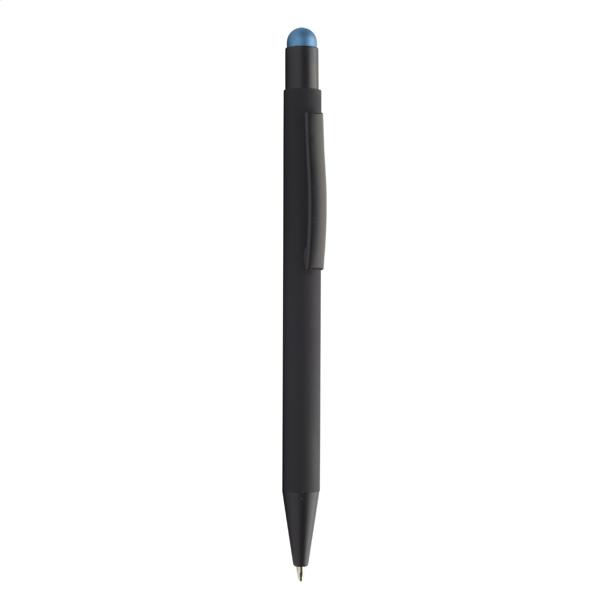 Penna a sfera in alluminio con gommino capacitivo e finitura gommata. Lo speciale rivestimento permette la personalizzazione ad incisione evidenziando il fondo in colore coordinato al gommino. Fornita con refill blu.