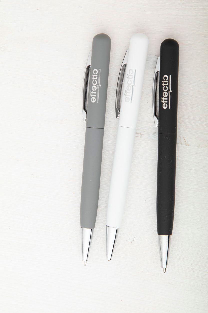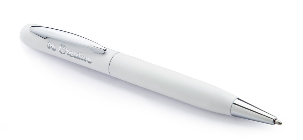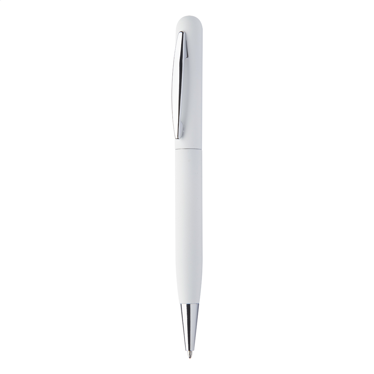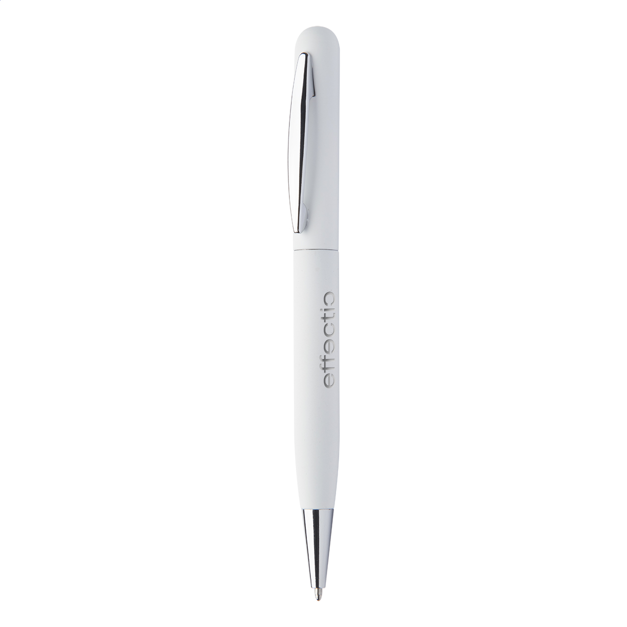 Penna a sfera in metallo con meccanismo a rotazione, finitura gommata e refill blu. Rivestimento speciale per incisione laser a specchio.