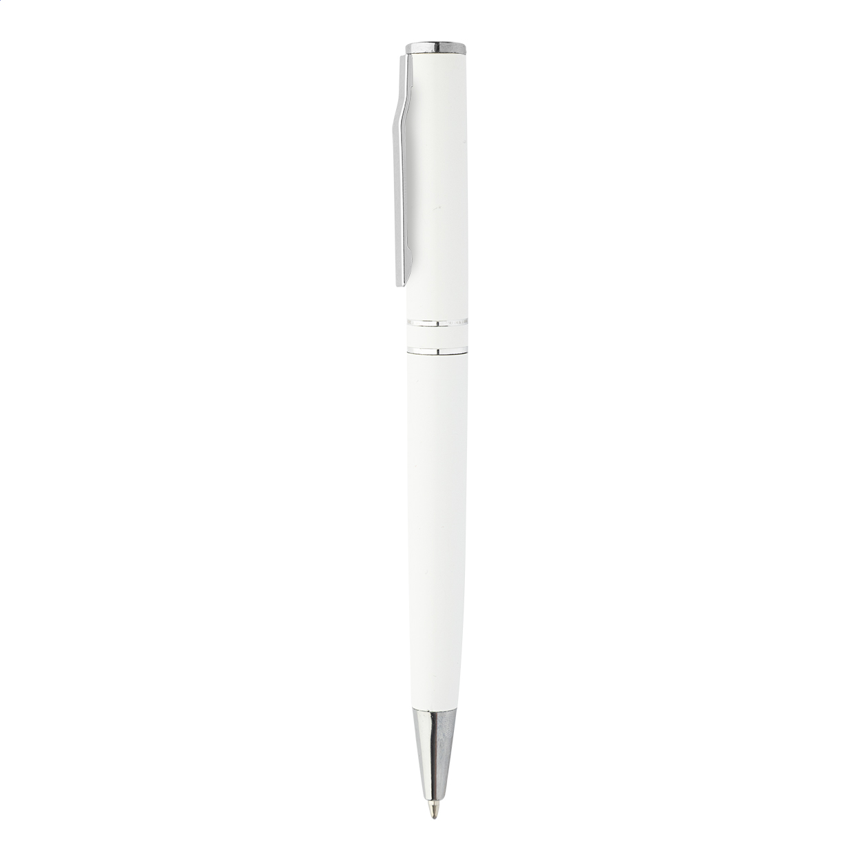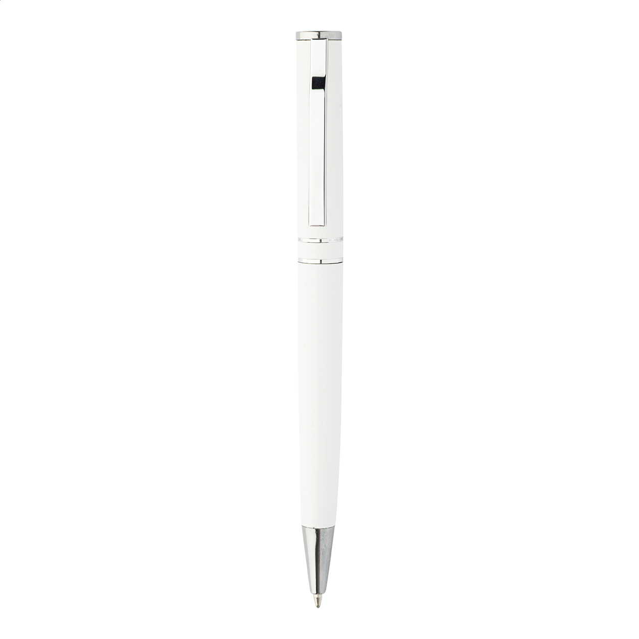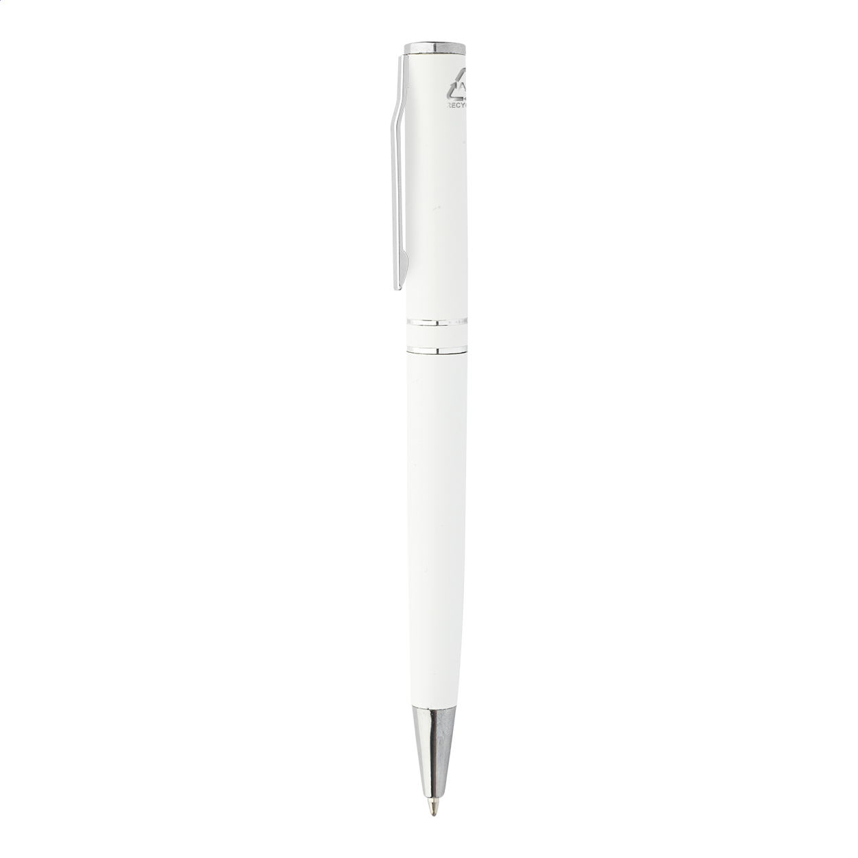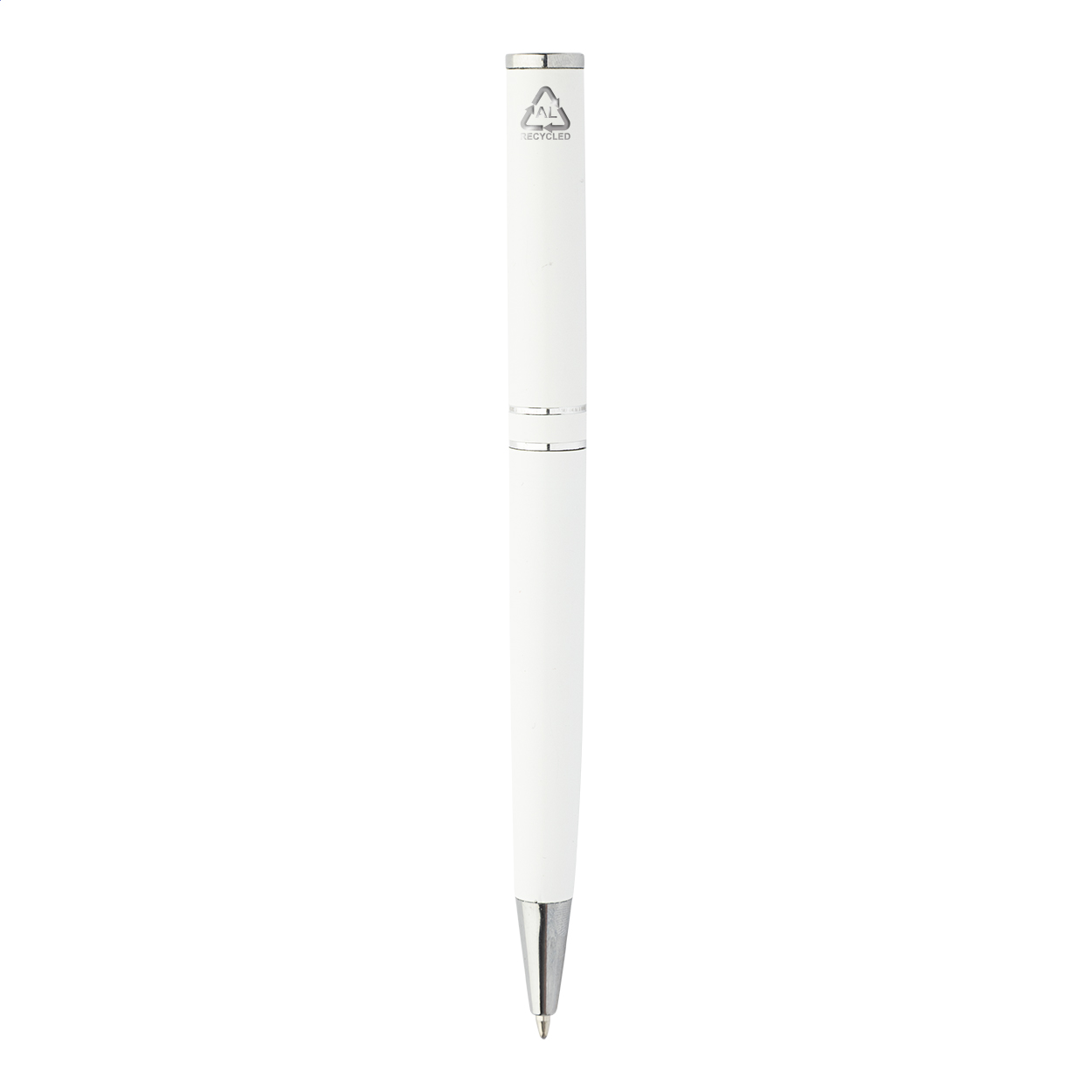 Penna a sfera con meccanismo a rotazione in alluminio riciclato co refill blu, elementi ed anelli cromati. Fornita in confezione regalo nera.