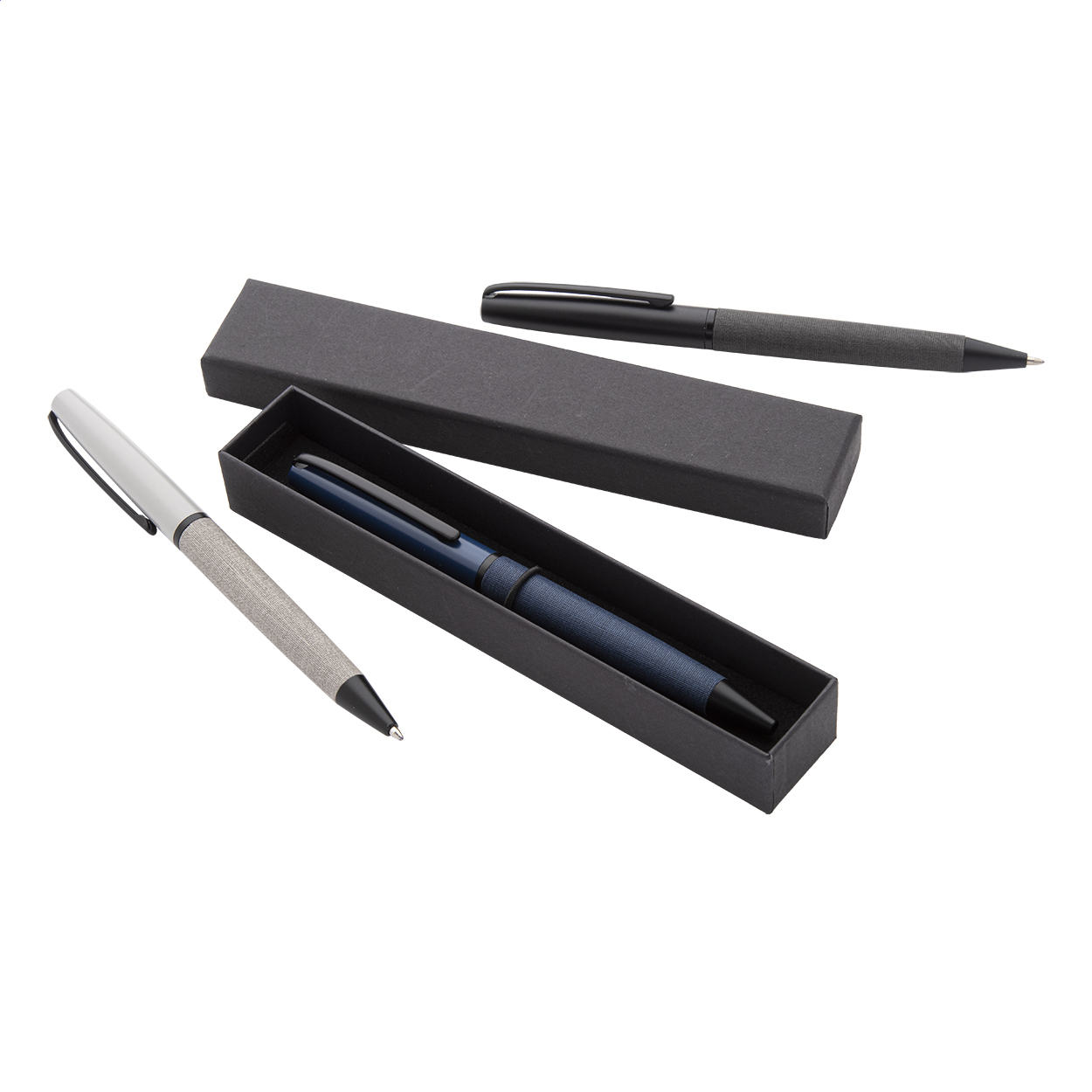 Elegante penna a sfera in metallo con meccanismo a rotazione, refill blu, fusto rivestito in pelle PU e parti nere. In confezione regalo nera.