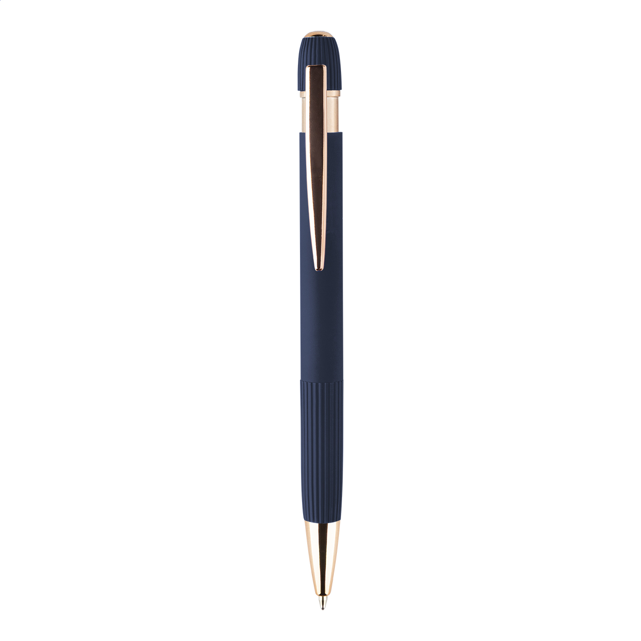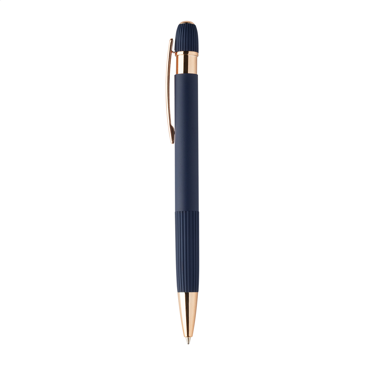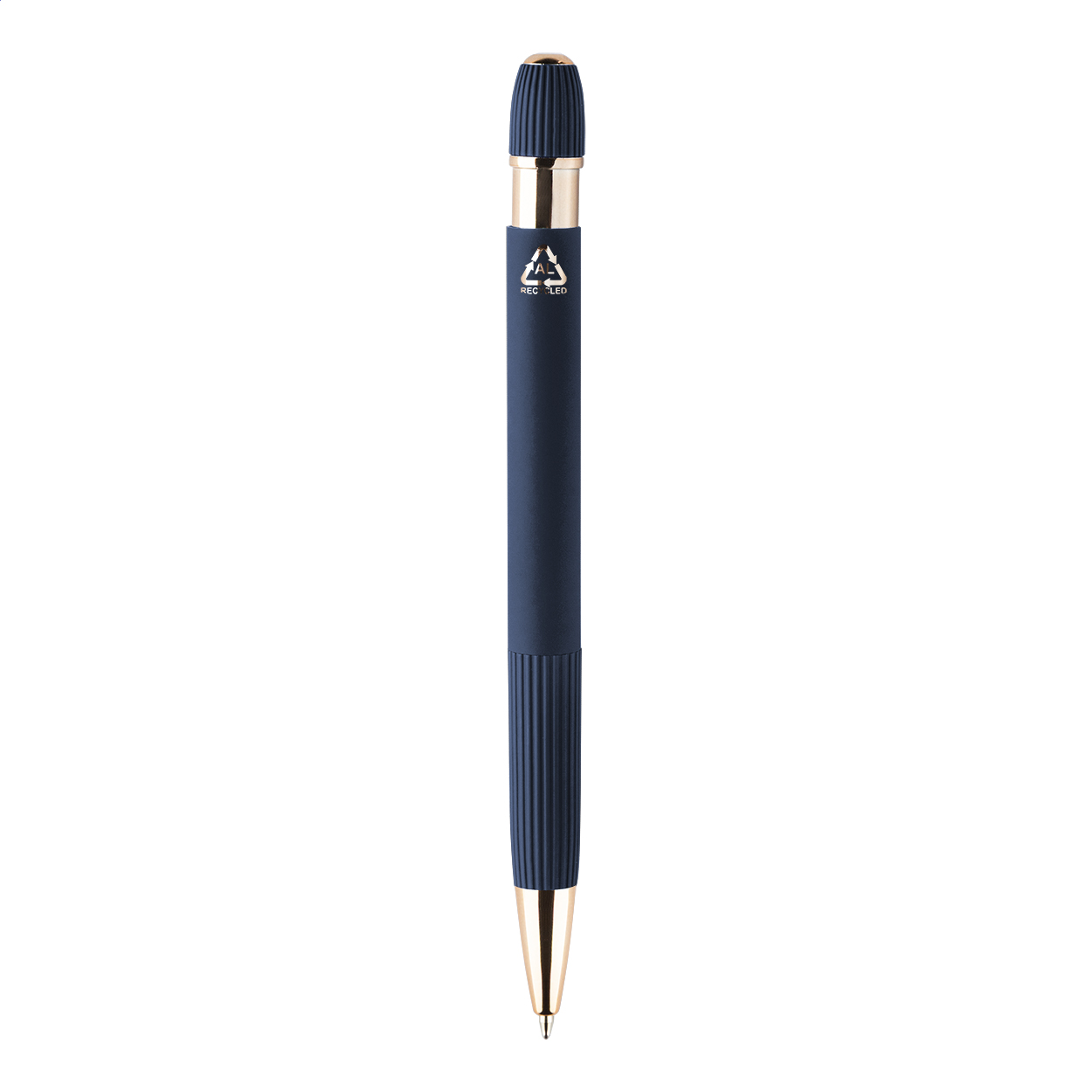 Penna a sfera in alluminio riciclato con refill blu, corpo gommato e dettagli in color oro rosa. Lo speciale rivestimento consente l'incisione laser a specchio in color oro rosa.