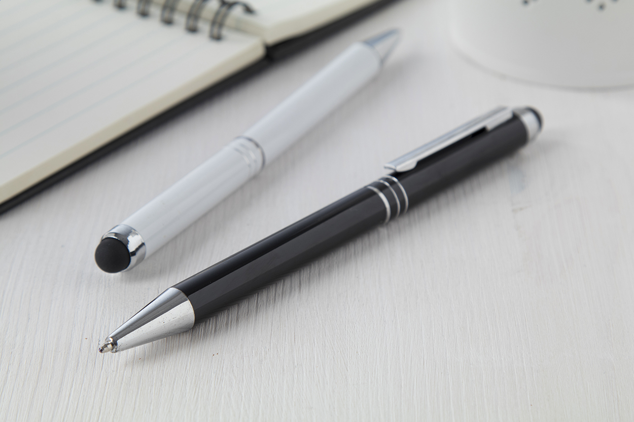 Penna a sfera in alluminio con gommino capacitivo e refill blu.