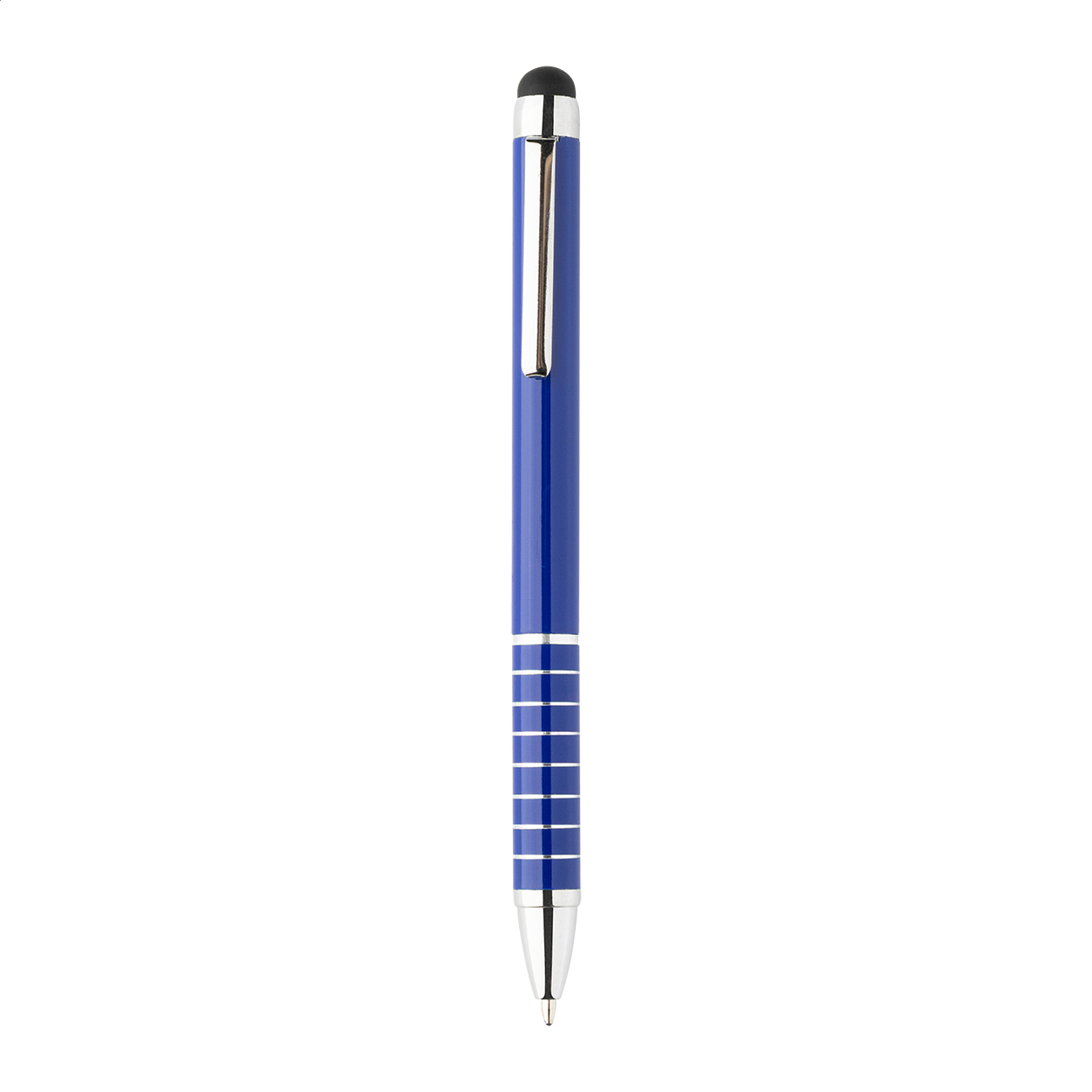 Penna a sfera in alluminio con gommino capacitivo e refill blu.