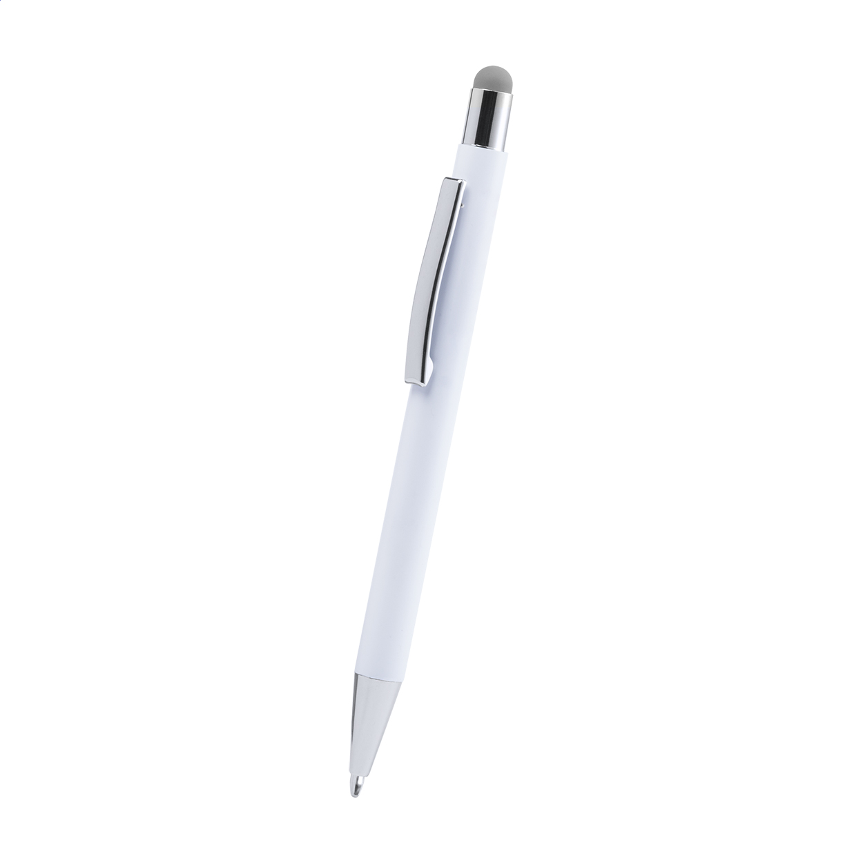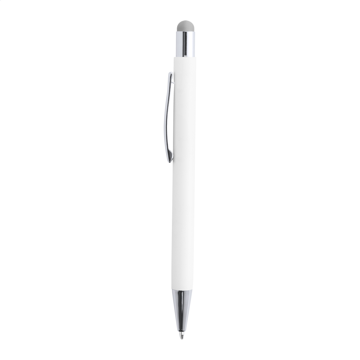 Penna a sfera in alluminio con gommino capacitivo e finitura gommata. Lo speciale rivestimento permette la personalizzazione ad incisione evidenziando il fondo in colore coordinato al gommino. Fornita con refill blu.