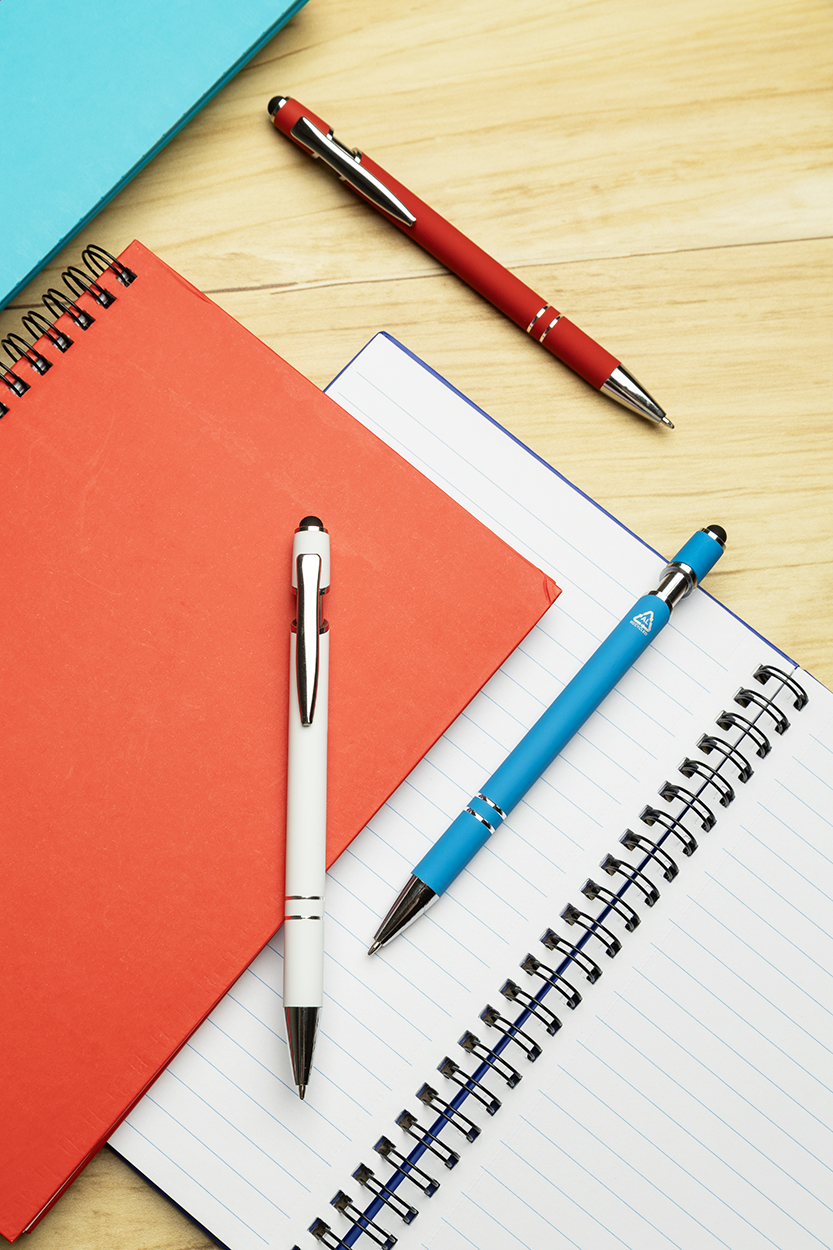 Penna a sfera capacitiva in alluminio riciclato con corpo gommato, dettagli cromati e refill blu.