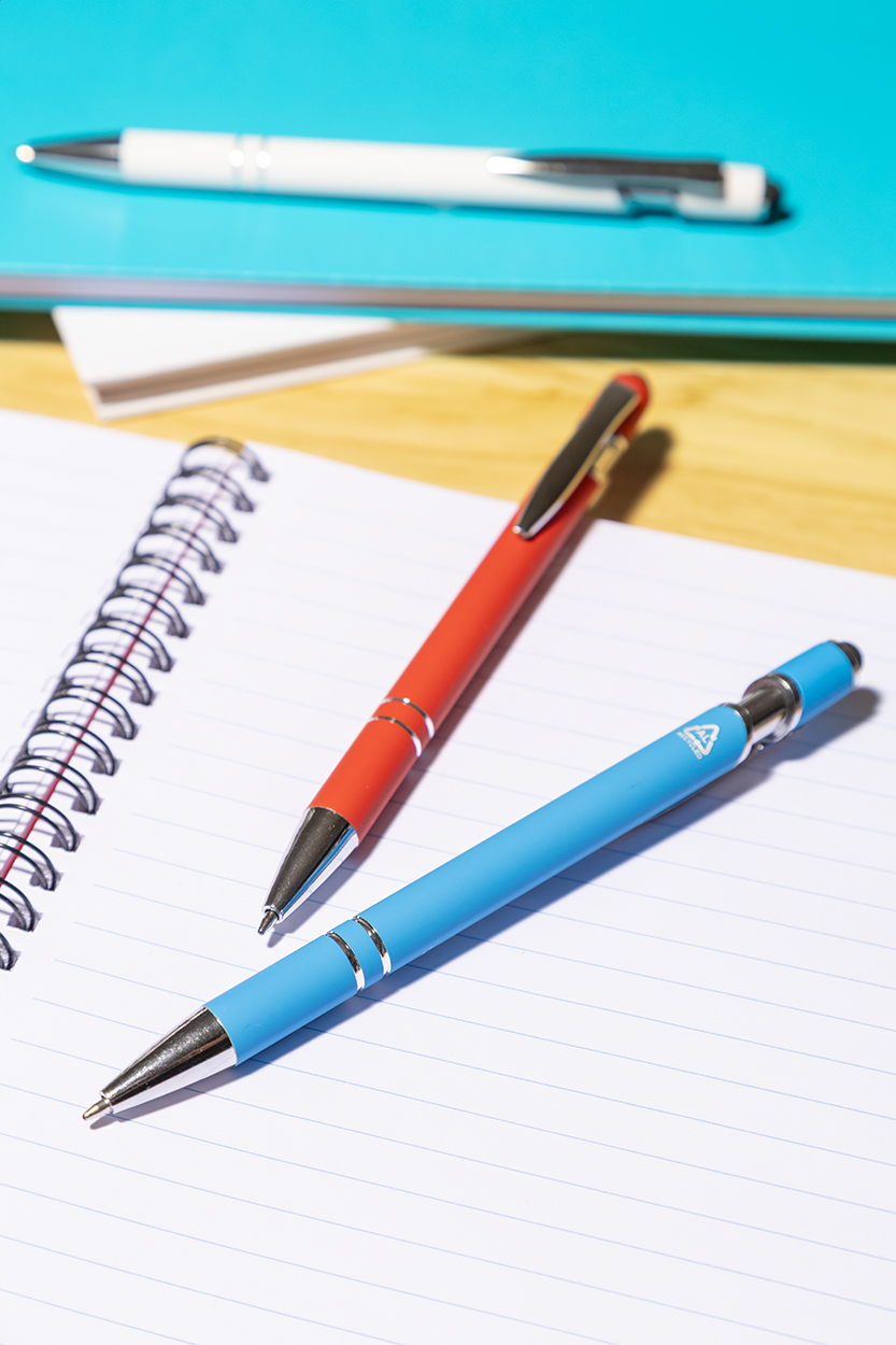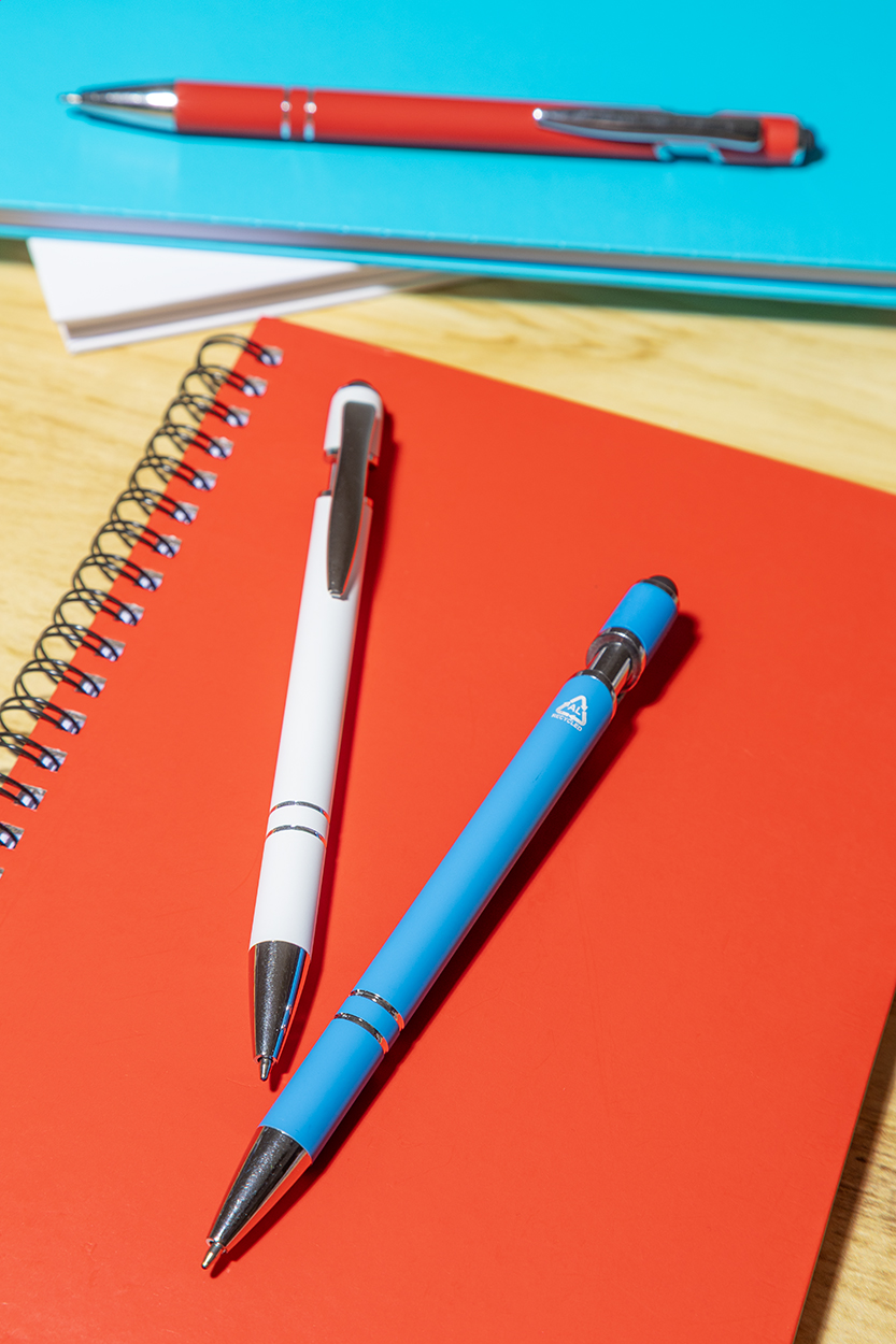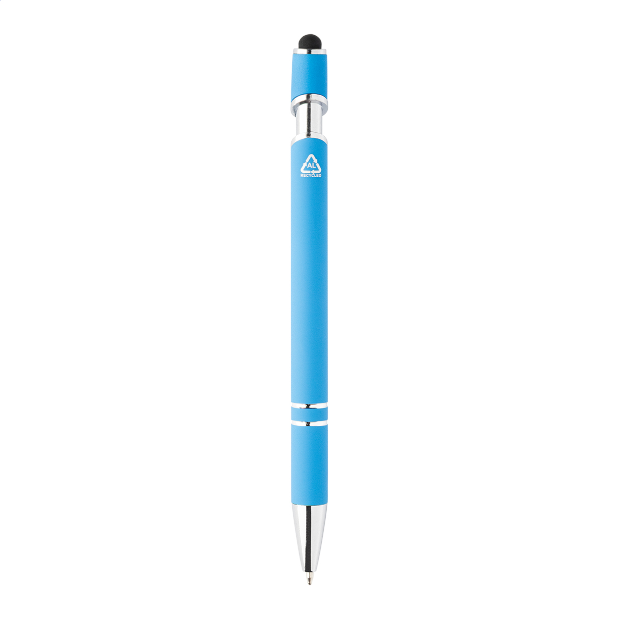 Penna a sfera capacitiva in alluminio riciclato con corpo gommato, dettagli cromati e refill blu.