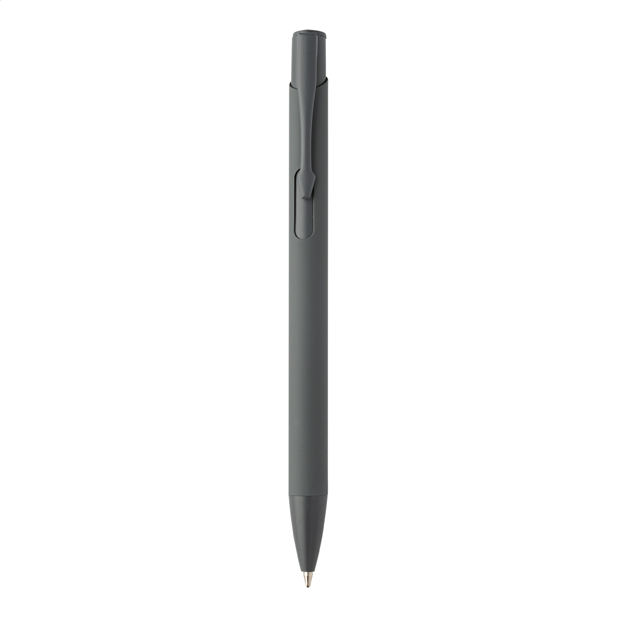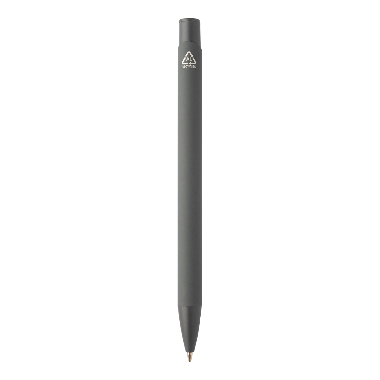 Penna a sfera in alluminio riciclato con corpo gommato, dettagli in colore coordinato e refill blu.