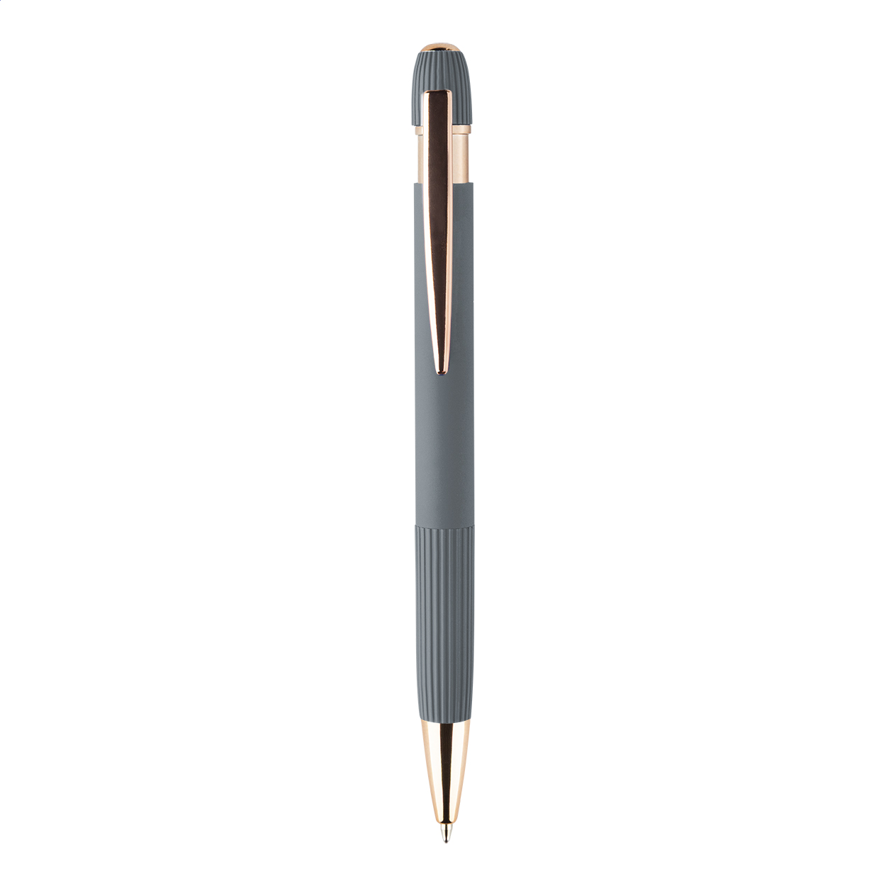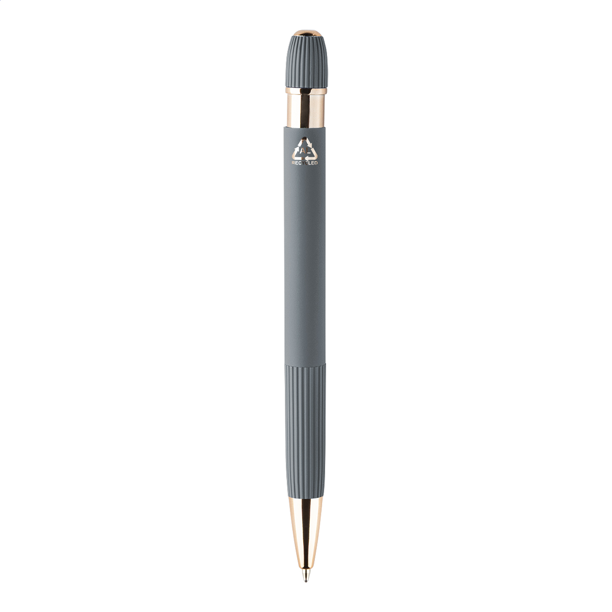 Penna a sfera in alluminio riciclato con refill blu, corpo gommato e dettagli in color oro rosa. Lo speciale rivestimento consente l'incisione laser a specchio in color oro rosa.