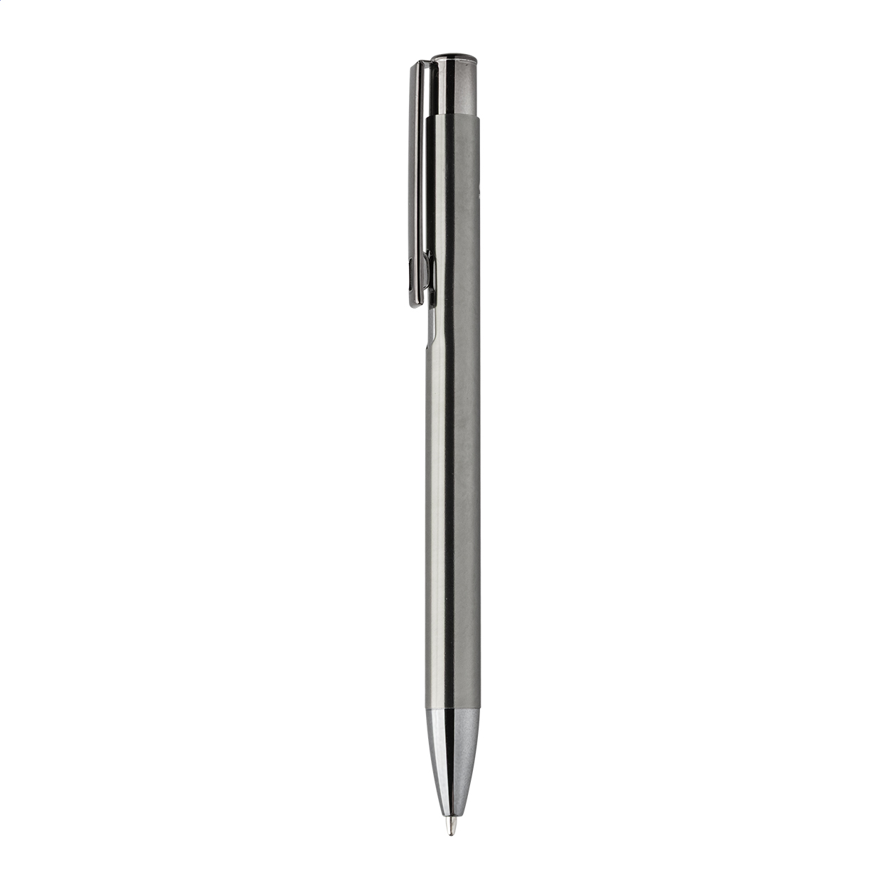 Penna a sfera in alluminio riciclato con finitura metallica lucida e refill blu.