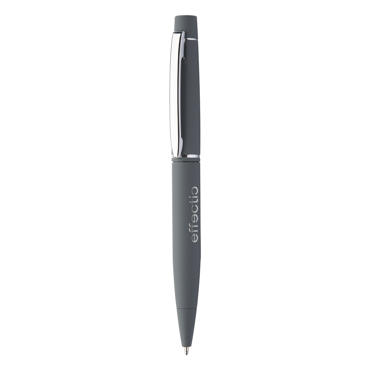 Penna a sfera in metallo con meccanismo a rotazione, finitura gommata e refill blu. Rivestimento speciale per incisione laser a specchio.