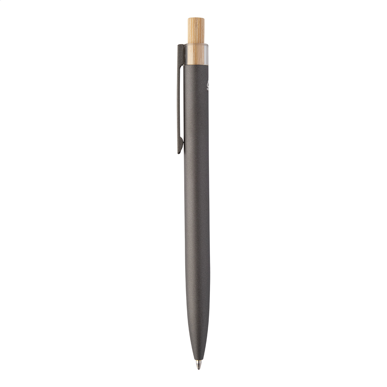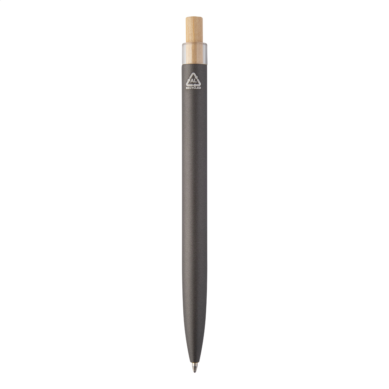 Penna a sfera in alluminio riciclato con pulsante in bambù e refill blu.