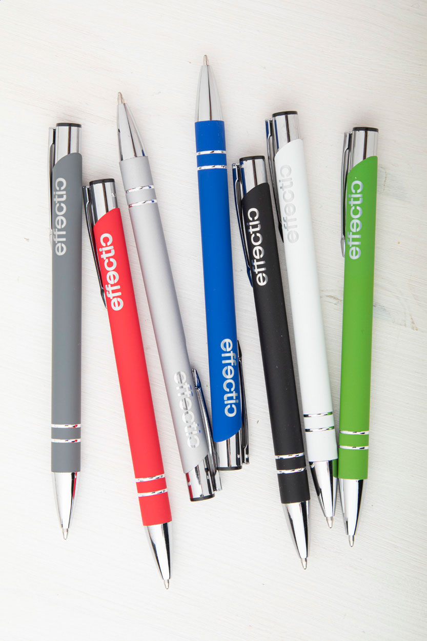 Penna a sfera in alluminio con finitura gommata e refill blu. Rivestimento speciale per incisione laser a specchio