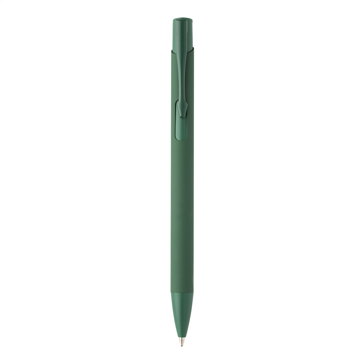 Penna a sfera in alluminio riciclato con corpo gommato, dettagli in colore coordinato e refill blu.