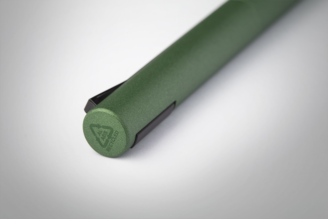 Penna a sfera in alluminio riciclato in colore metallizzato opaco, con refill blu, fusto superiore in ABS riciclato e speciale movimento a clip.