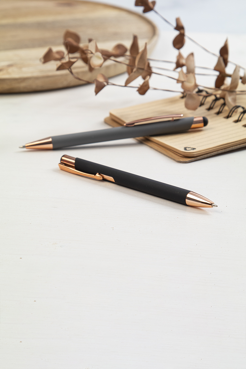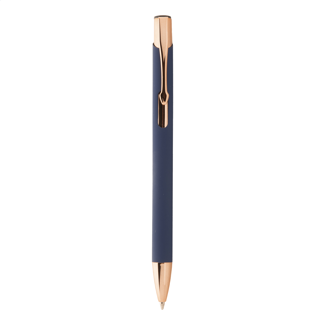 Penna a sfera in alluminio riciclato con finitura gommata, dettagli in color oro rosa e refill blu. Rivestimento speciale per incisione laser a specchio in coordinato colore oro rosa.