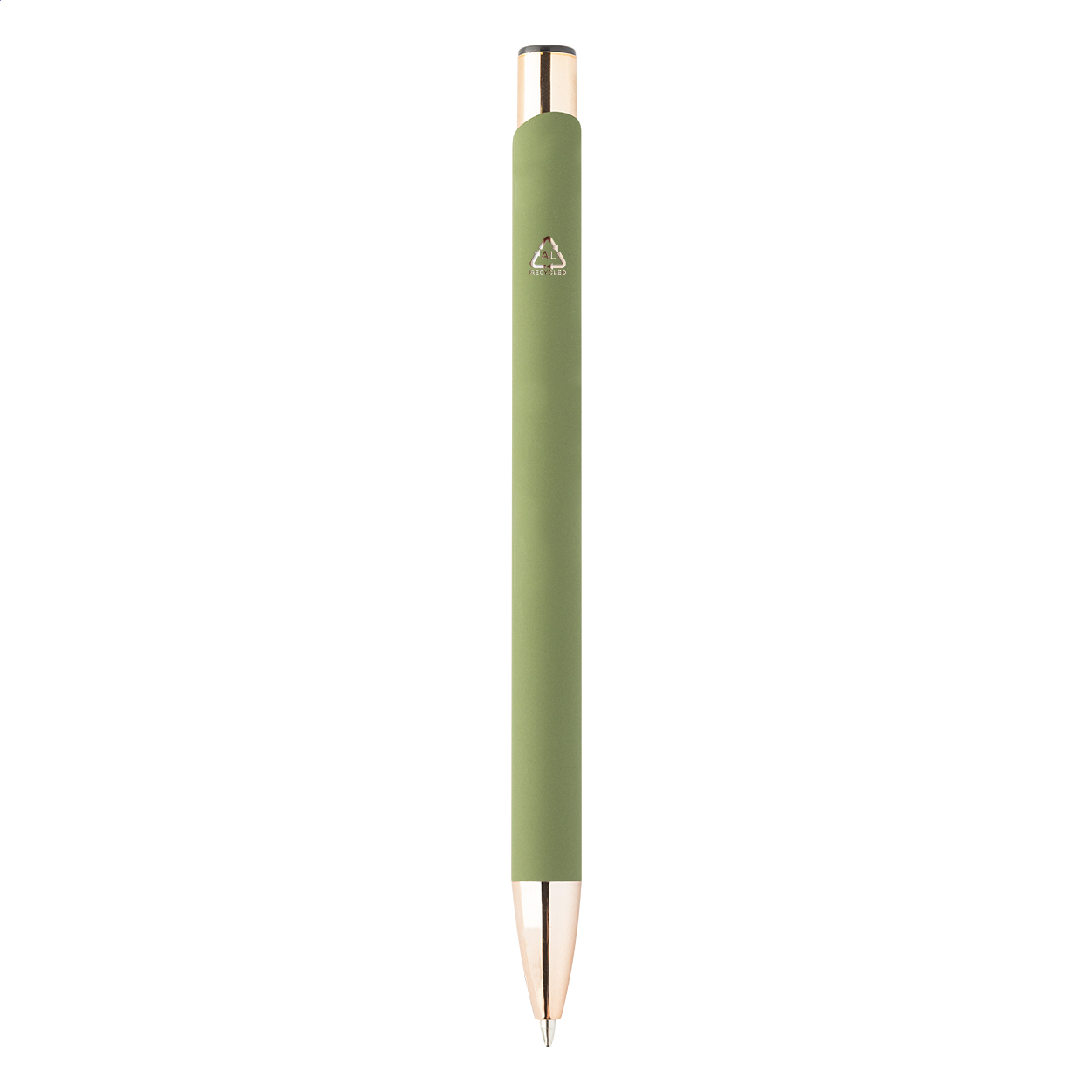 Penna a sfera in alluminio riciclato con finitura gommata, dettagli in color oro rosa e refill blu. Rivestimento speciale per incisione laser a specchio in coordinato colore oro rosa.