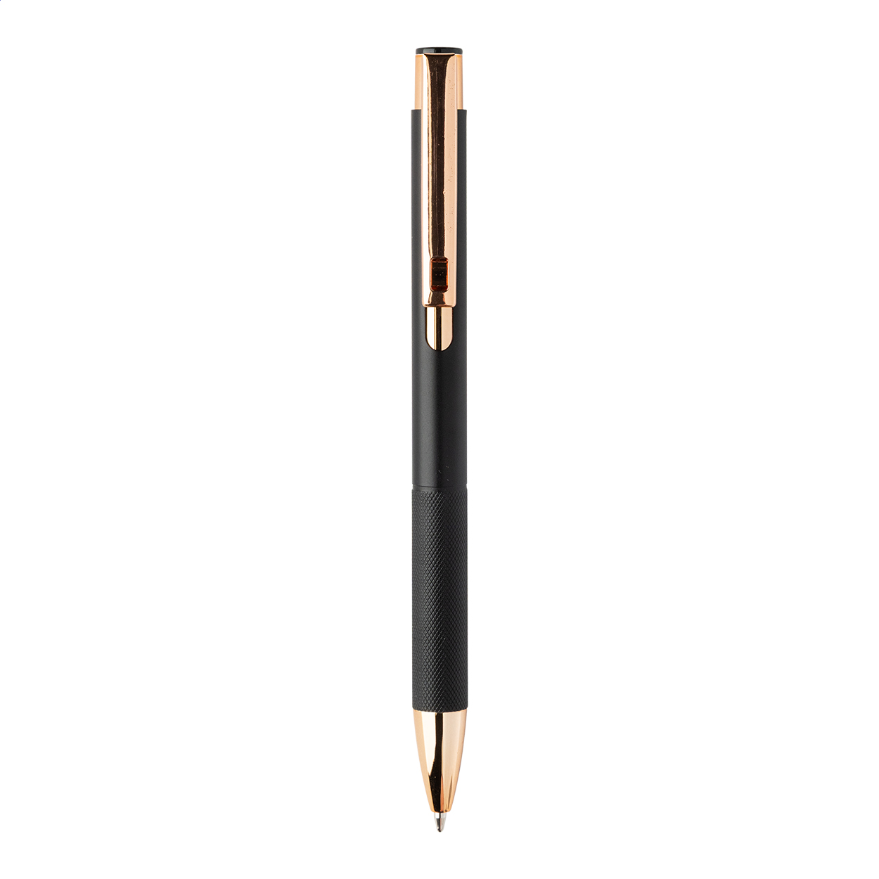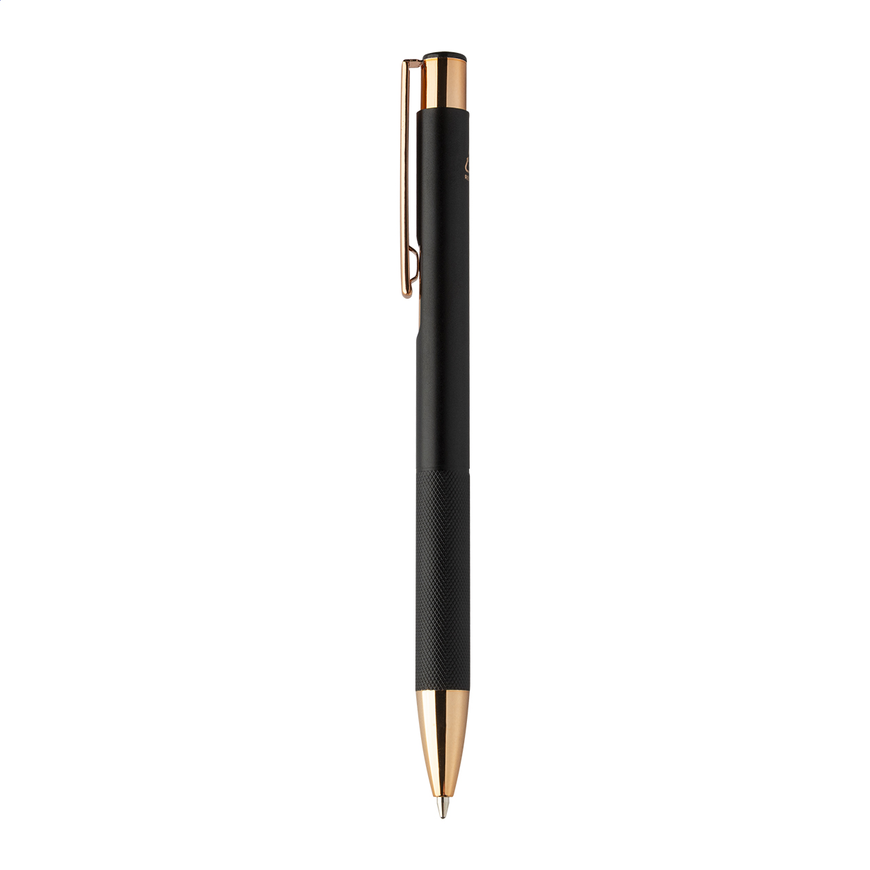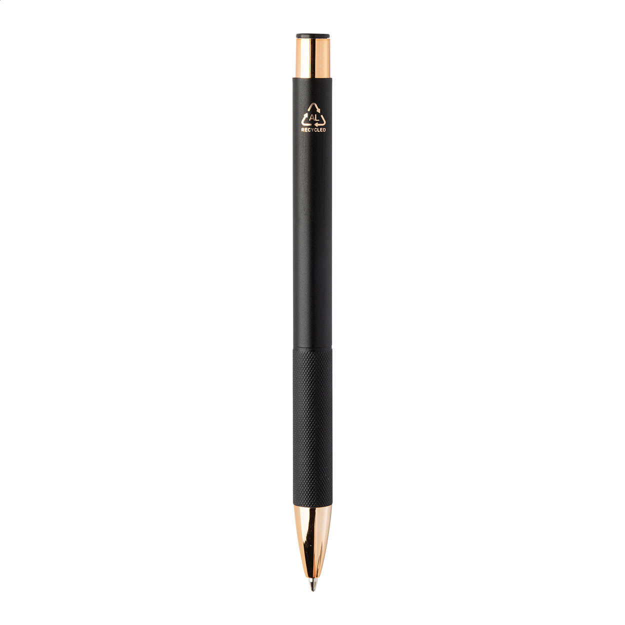 Penna a sfera in alluminio riciclato con corpo in finitura opaca, impugnatura testurizzata, dettagli in color oro rosa e refill blu. Lo speciale rivestimento permette incisioni a laser a specchio nel colore oro rosa.