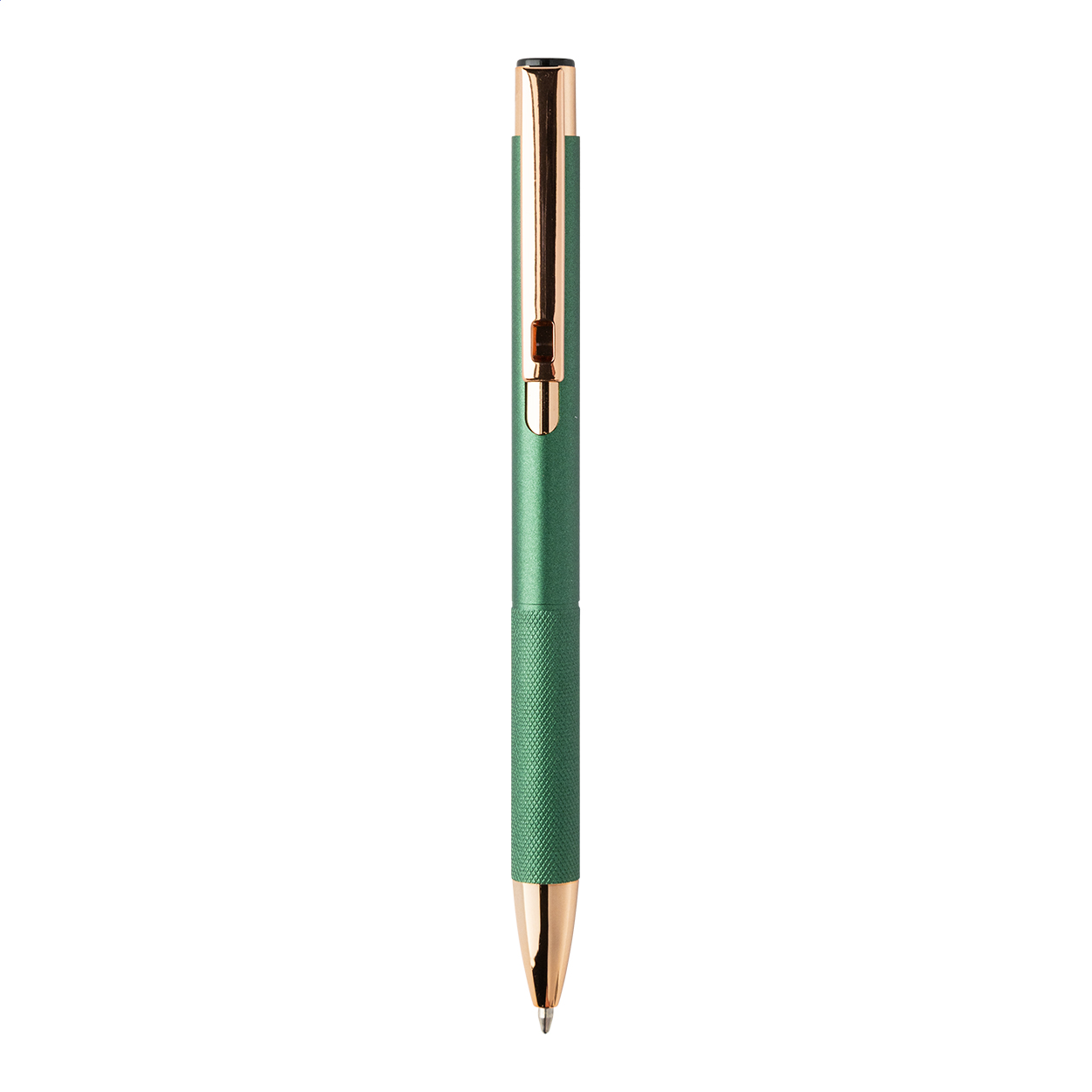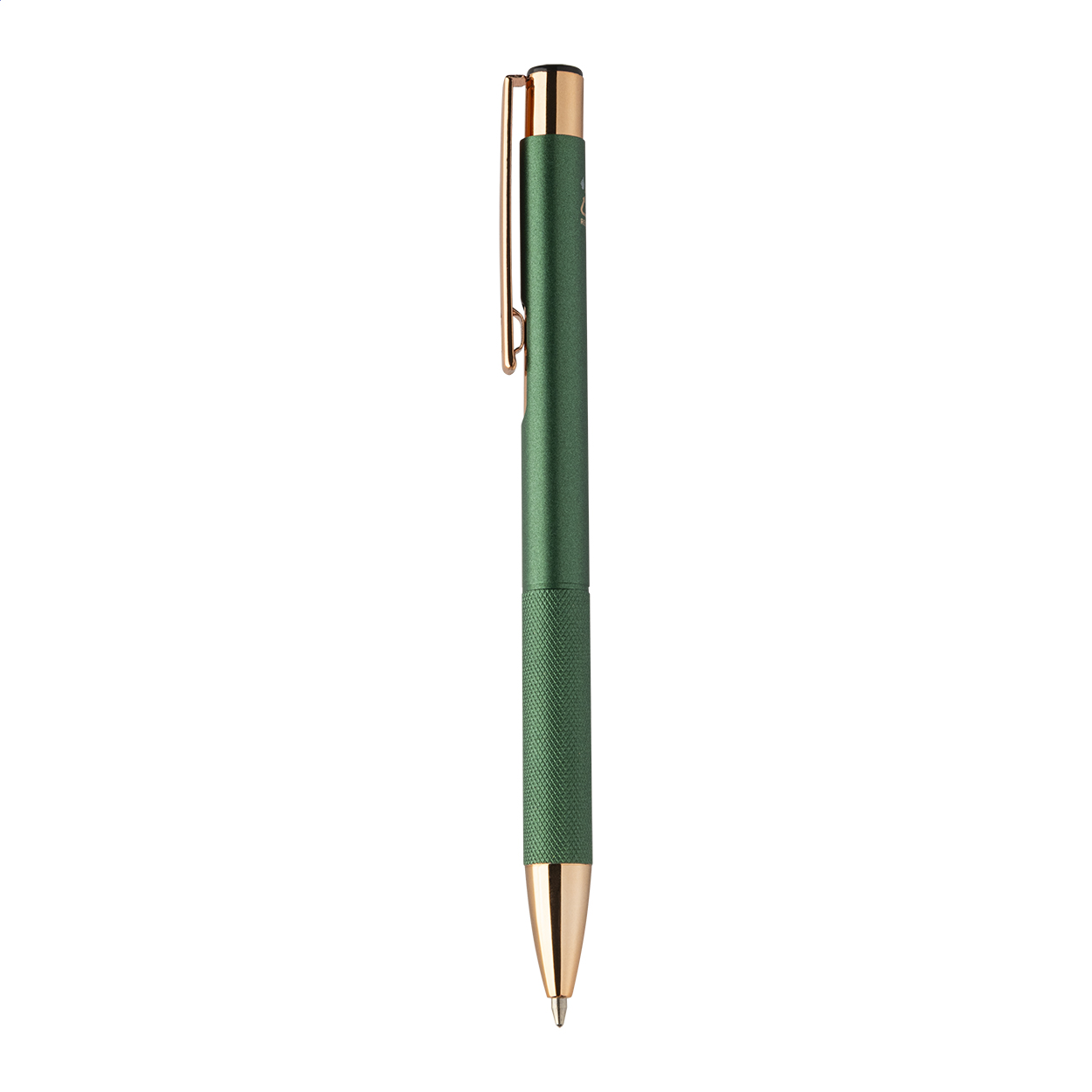 Penna a sfera in alluminio riciclato con corpo in finitura opaca, impugnatura testurizzata, dettagli in color oro rosa e refill blu. Lo speciale rivestimento permette incisioni a laser a specchio nel colore oro rosa.