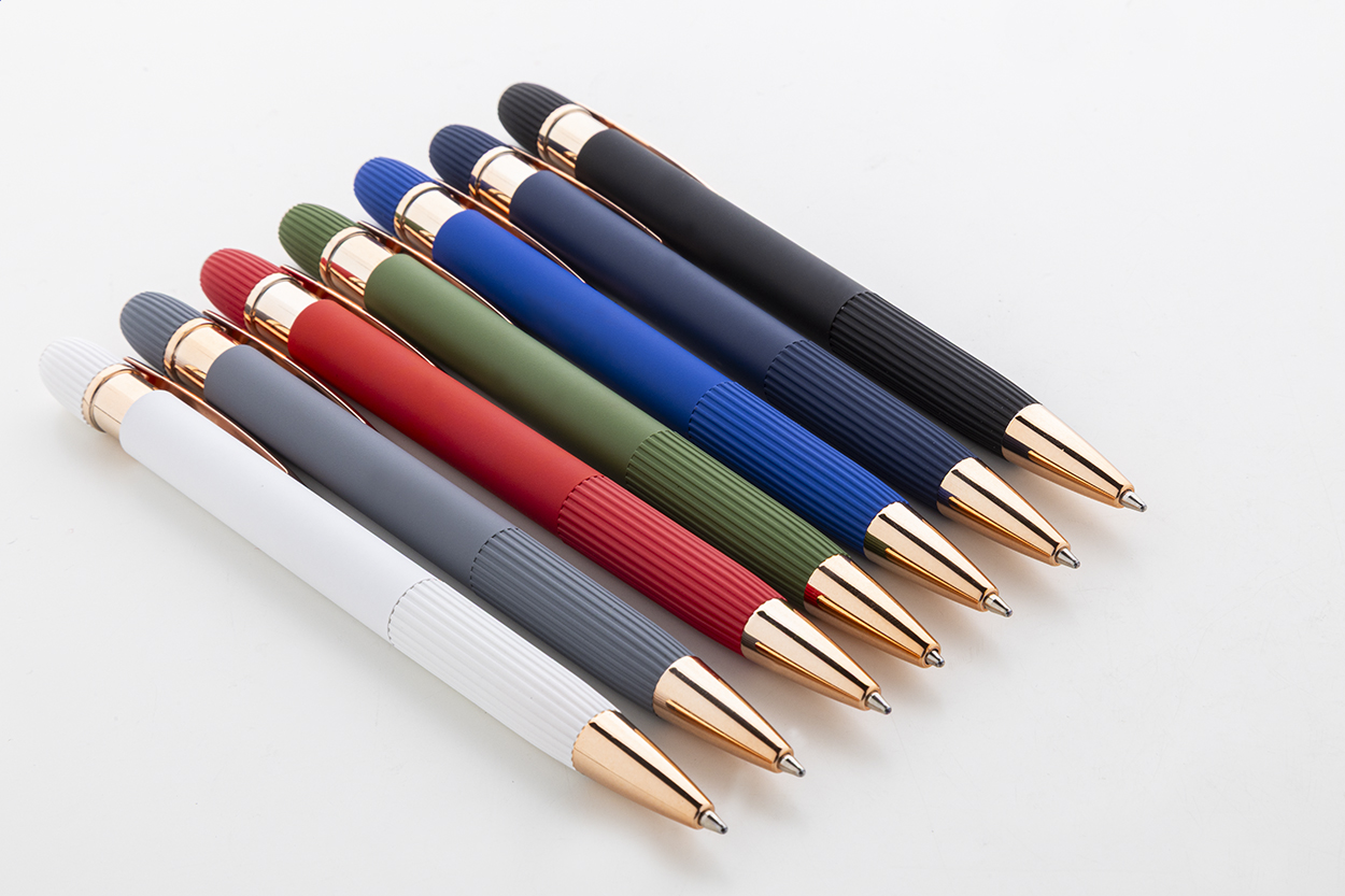 Penna a sfera in alluminio riciclato con refill blu, corpo gommato e dettagli in color oro rosa. Lo speciale rivestimento consente l'incisione laser a specchio in color oro rosa.