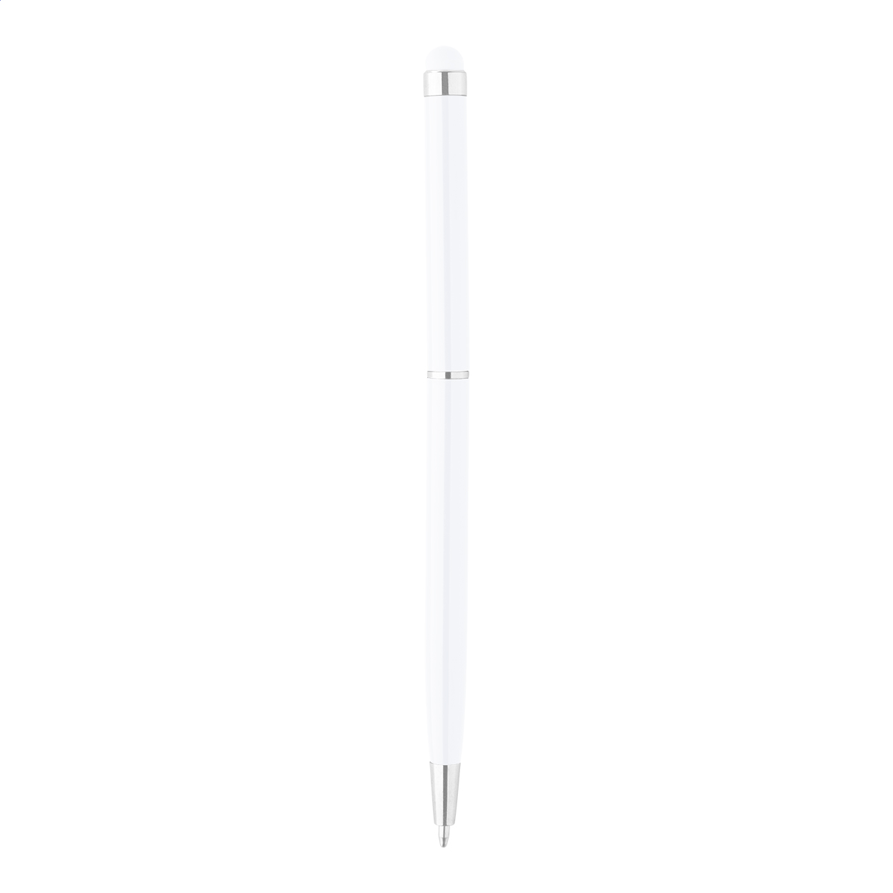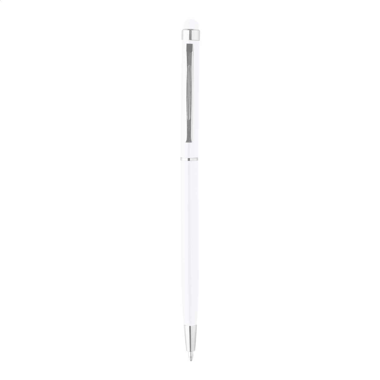 Penna a sfera in alluminio colorato con gommino capacitivo in colore coordinato e refill blu.