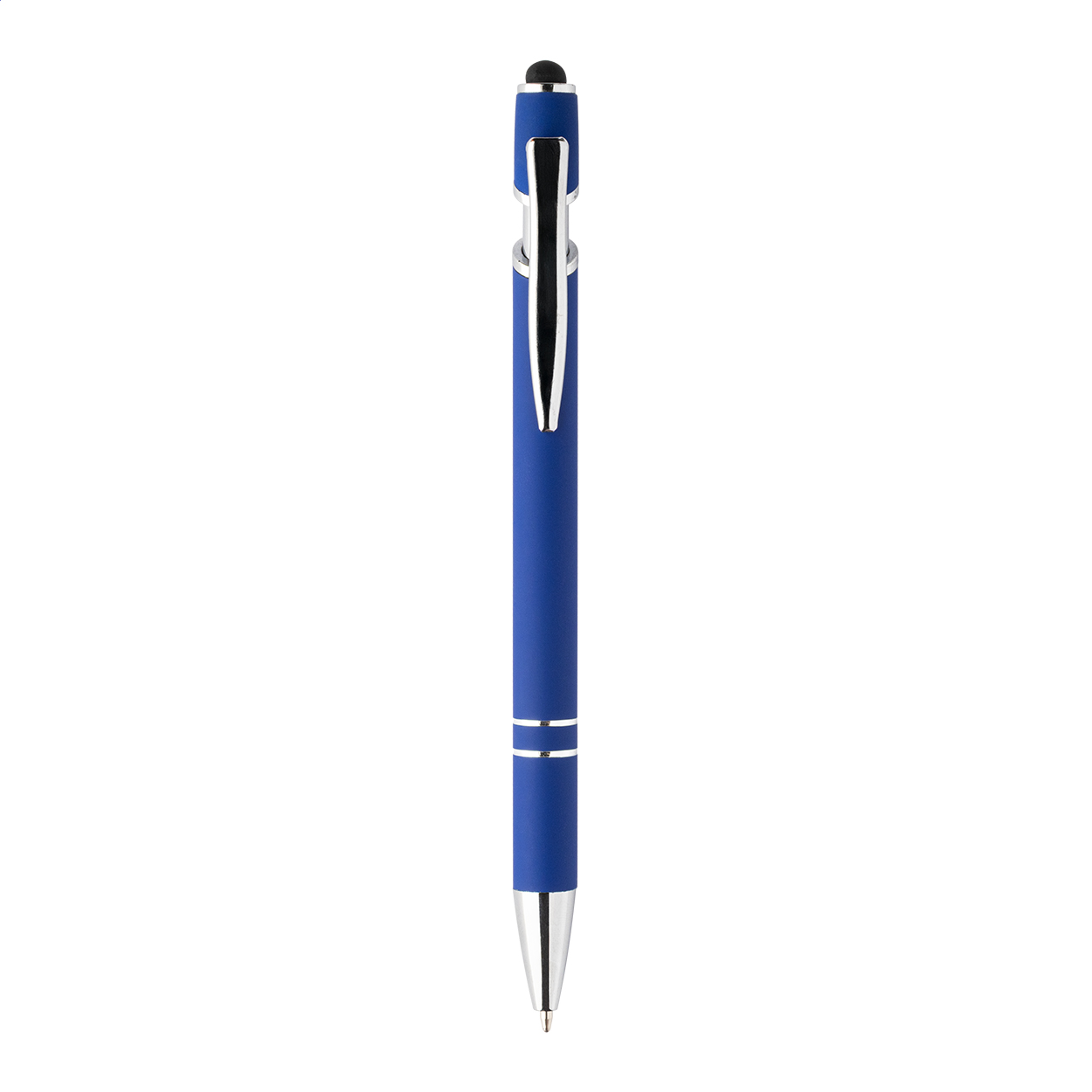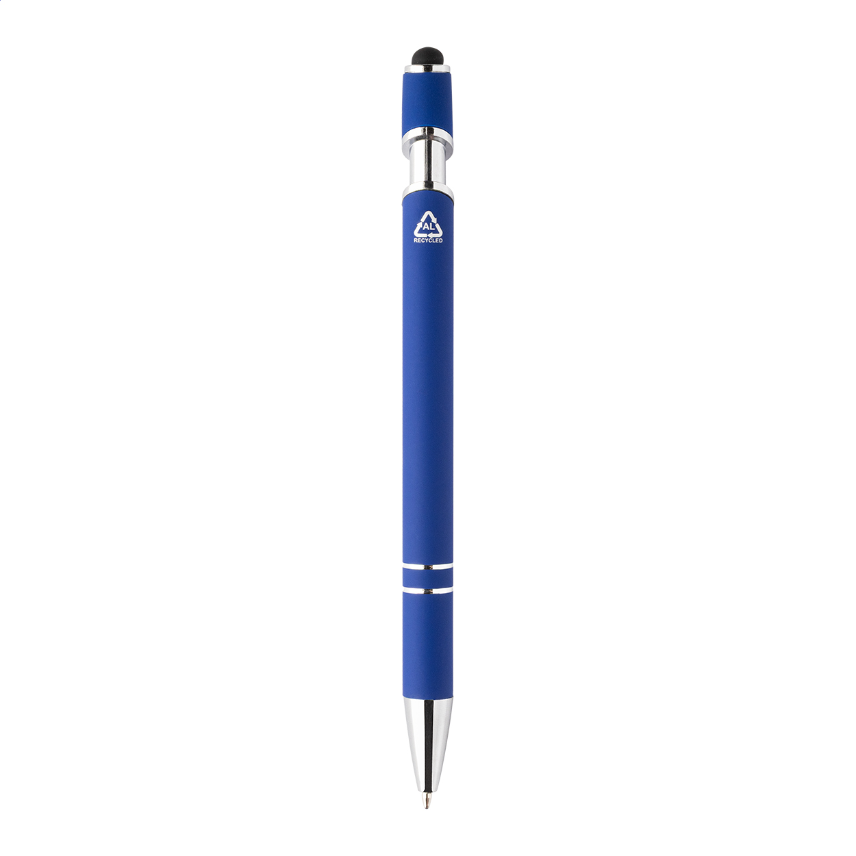 Penna a sfera capacitiva in alluminio riciclato con corpo gommato, dettagli cromati e refill blu.