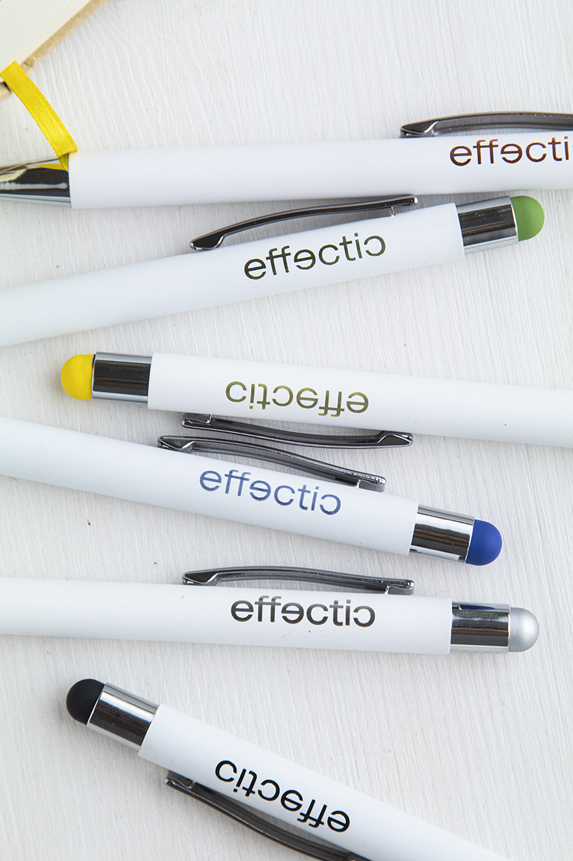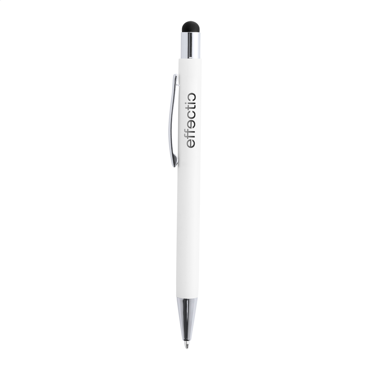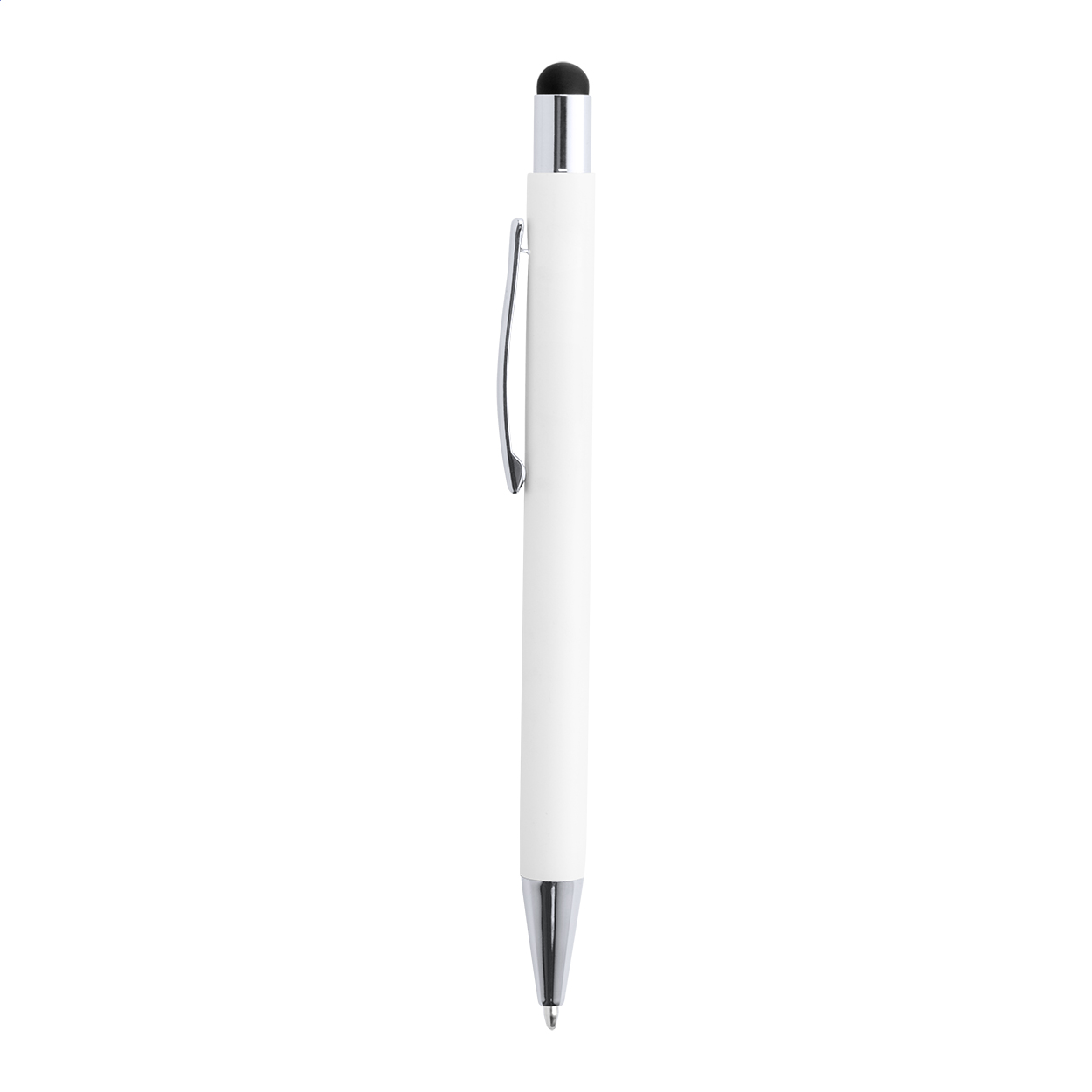 Penna a sfera in alluminio con gommino capacitivo e finitura gommata. Lo speciale rivestimento permette la personalizzazione ad incisione evidenziando il fondo in colore coordinato al gommino. Fornita con refill blu.