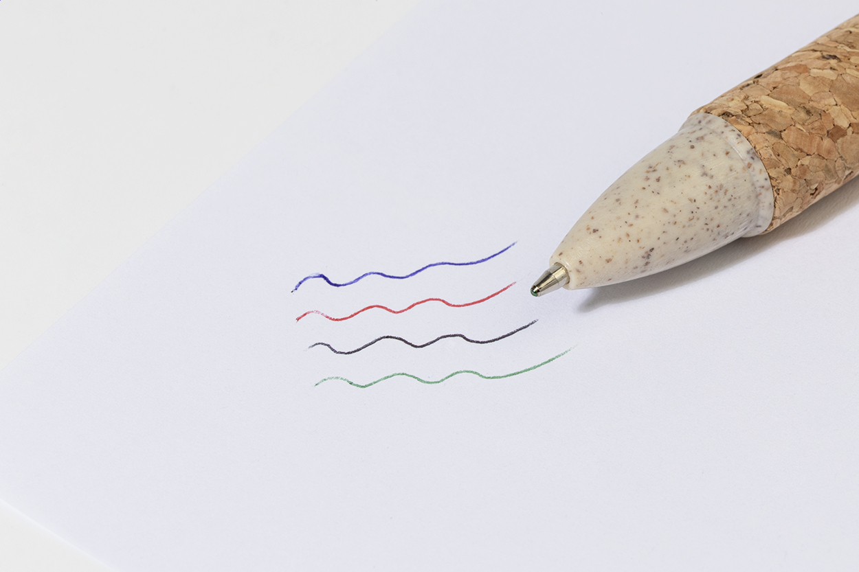 Penna a sfera in plastica ecologica di paglia di grano con fusto rivestito in sughero naturale, impugnatura in gomma e refill blu.