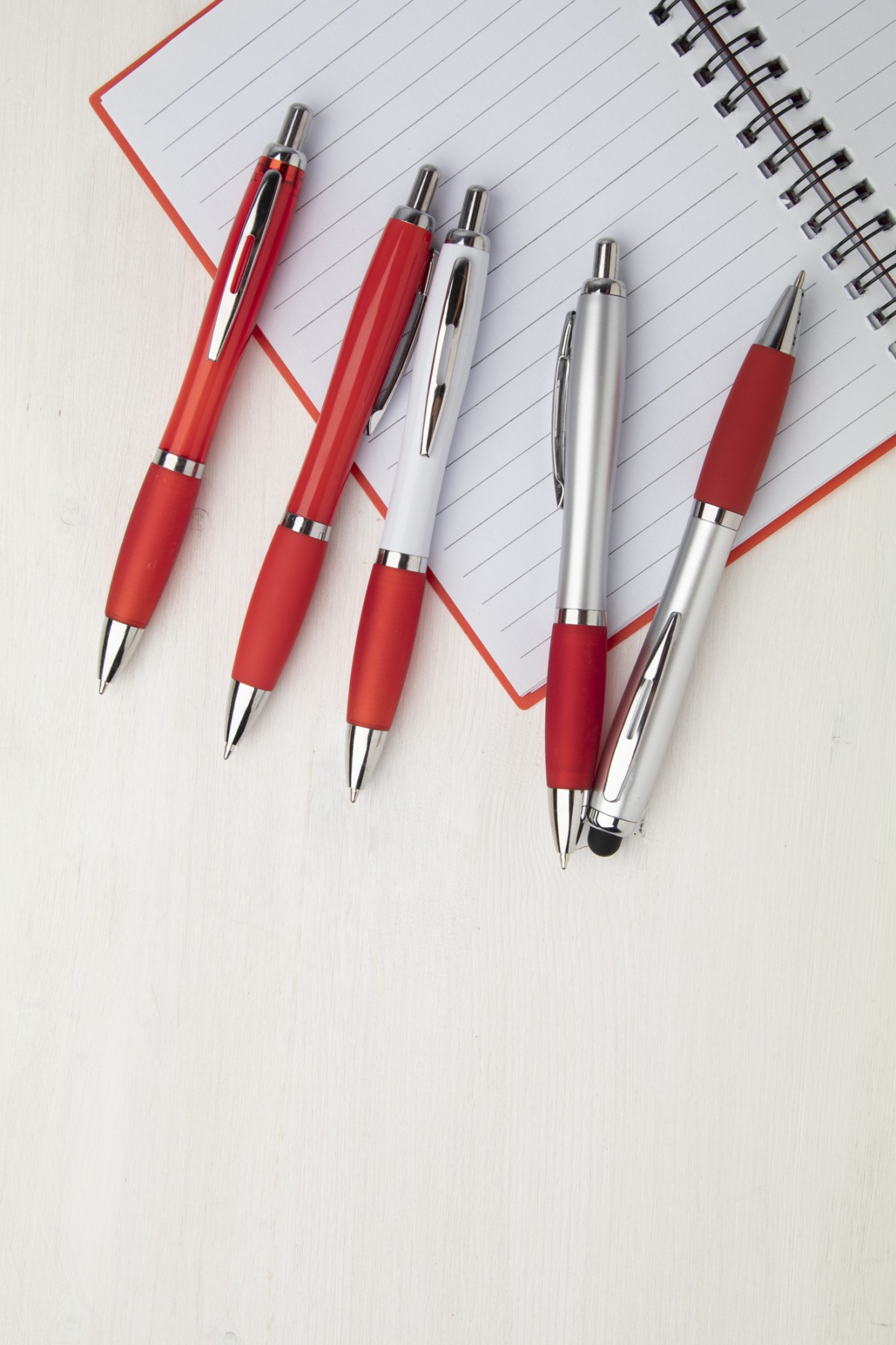 Penna a sfera in plastica con corpo argentato ed impugnatura in gomma colorata. Fornita con refill blu.