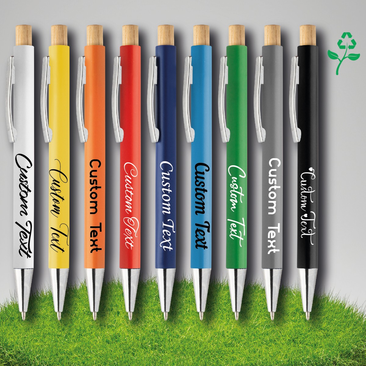 Penna a sfera in plastica ABS riciclata con pulsante in bambù, clip in metallo e refill blu.