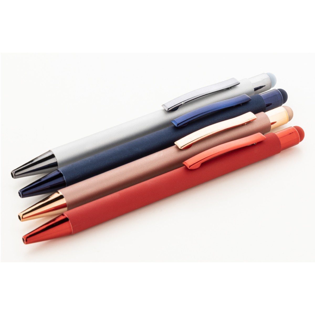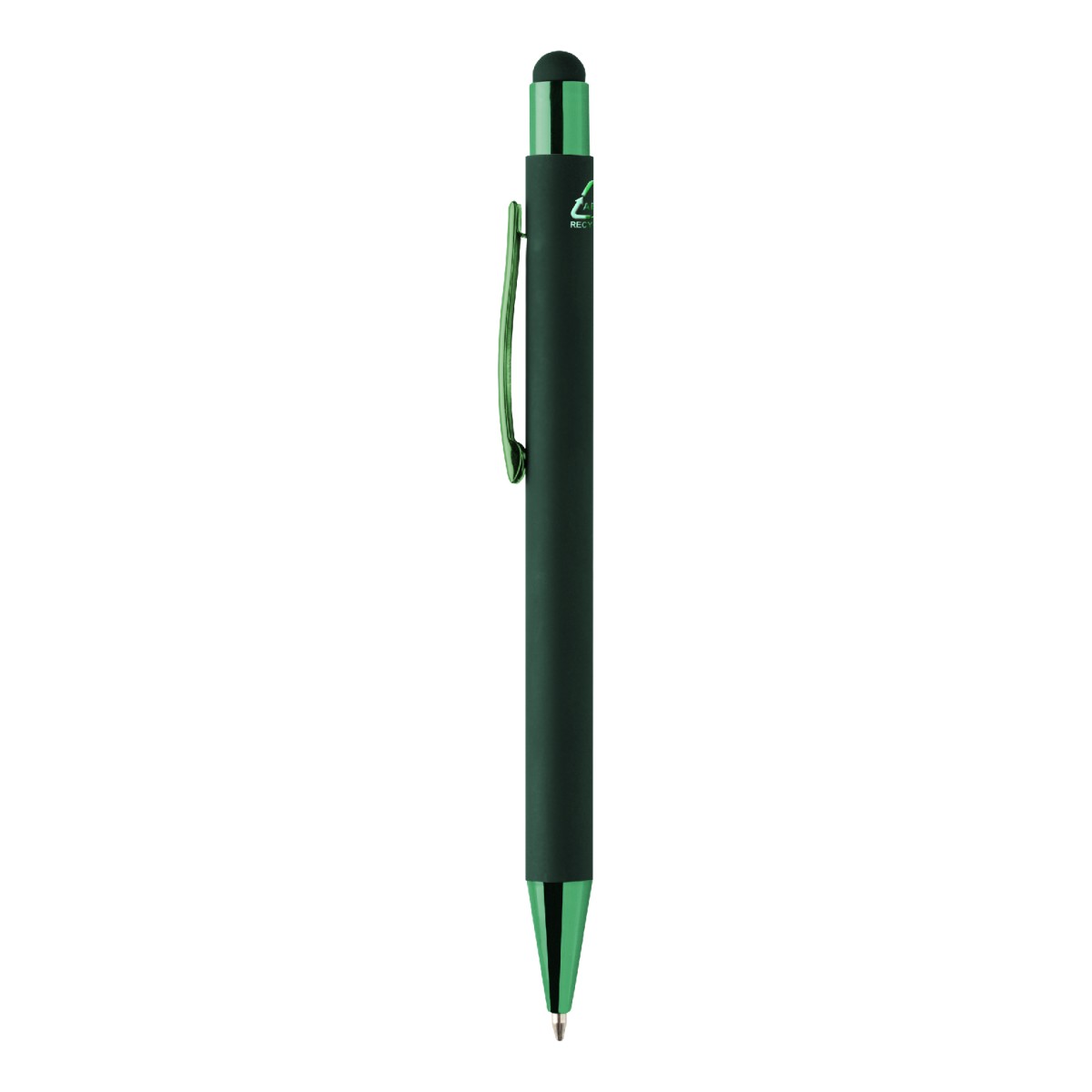 Penna a sfera capacitiva in alluminio riciclato con refill blu, fusto gommato e parti con finitura colorata metallizzata lucida.