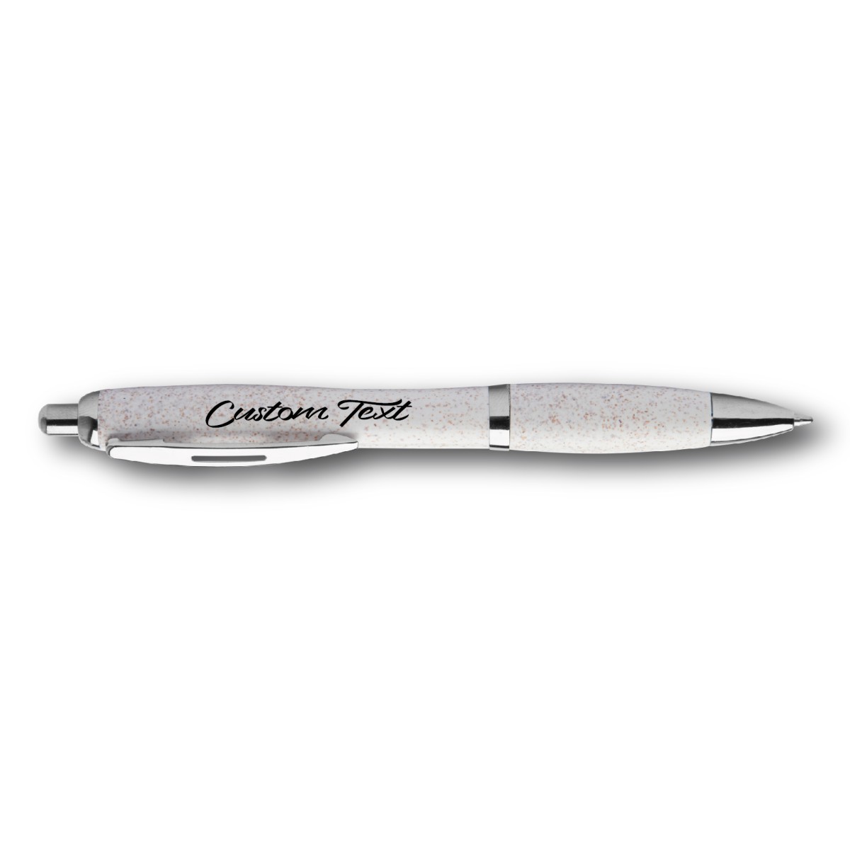 Penna a sfera con dettagli cromati e parti in plastica ecologica di paglia di grano. Refill blu.