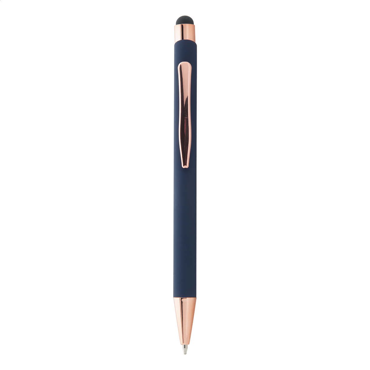 Penna a sfera capacitiva in alluminio riciclato con finitura gommata, dettagli color oro rosa e refill blu. Rivestimento speciale per incisione laser a specchio in coordinato colore oro rosa.