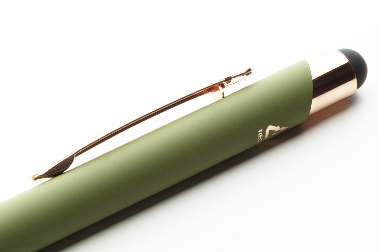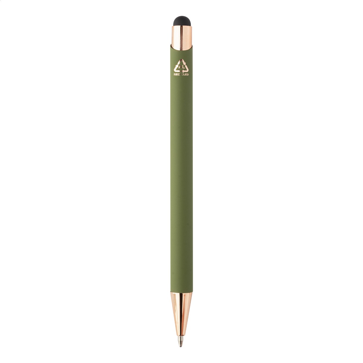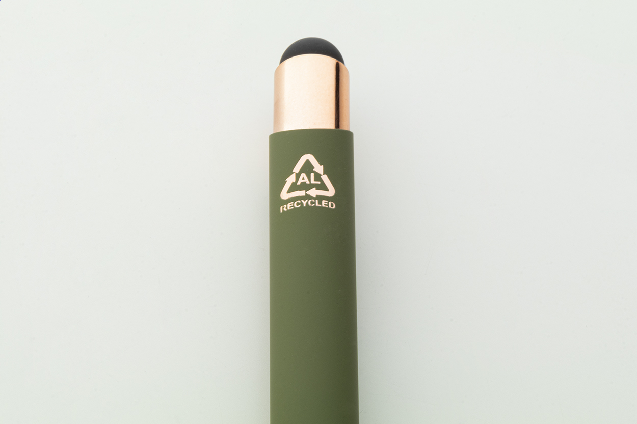 Penna a sfera capacitiva in alluminio riciclato con finitura gommata, dettagli color oro rosa e refill blu. Rivestimento speciale per incisione laser a specchio in coordinato colore oro rosa.