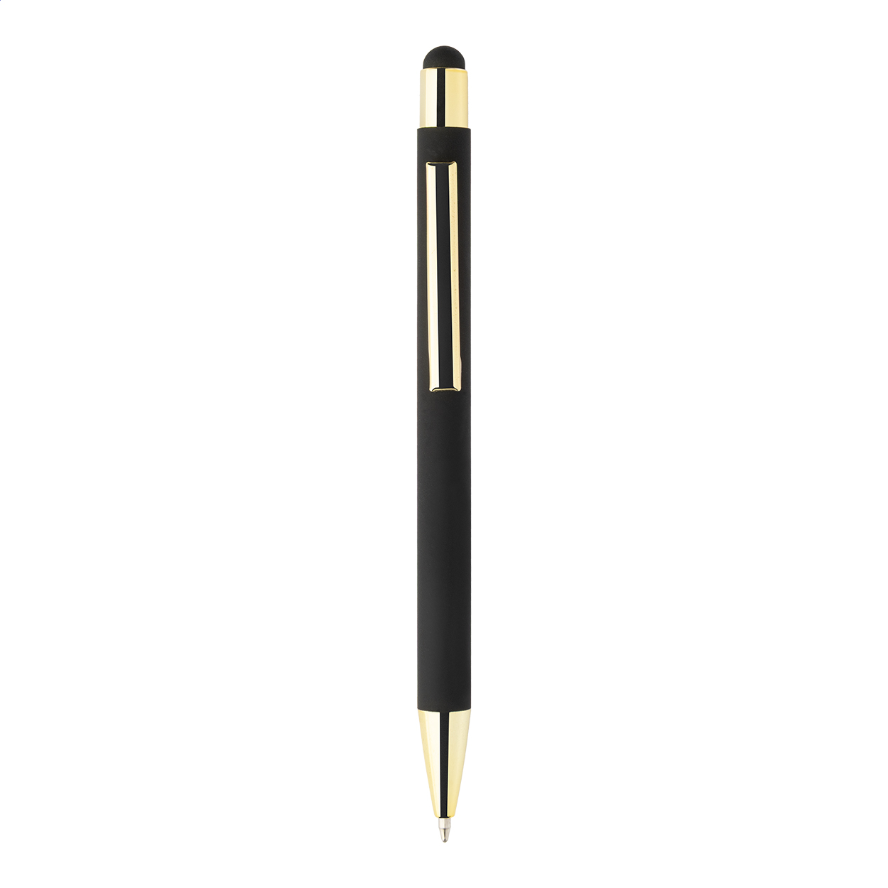 Penna a sfera capacitiva in alluminio riciclato con corpo gommato nero e parti colorate con finitura metallica lucida. Lo speciale rivestimento permette l'incisione a specchio in colore coordinato delle parti metalliche. Refill blu.