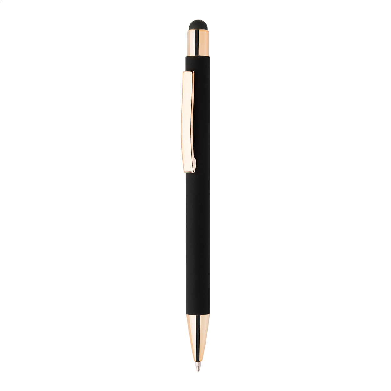 Penna a sfera capacitiva in alluminio riciclato con corpo gommato nero e parti colorate con finitura metallica lucida. Lo speciale rivestimento permette l'incisione a specchio in colore coordinato delle parti metalliche. Refill blu.