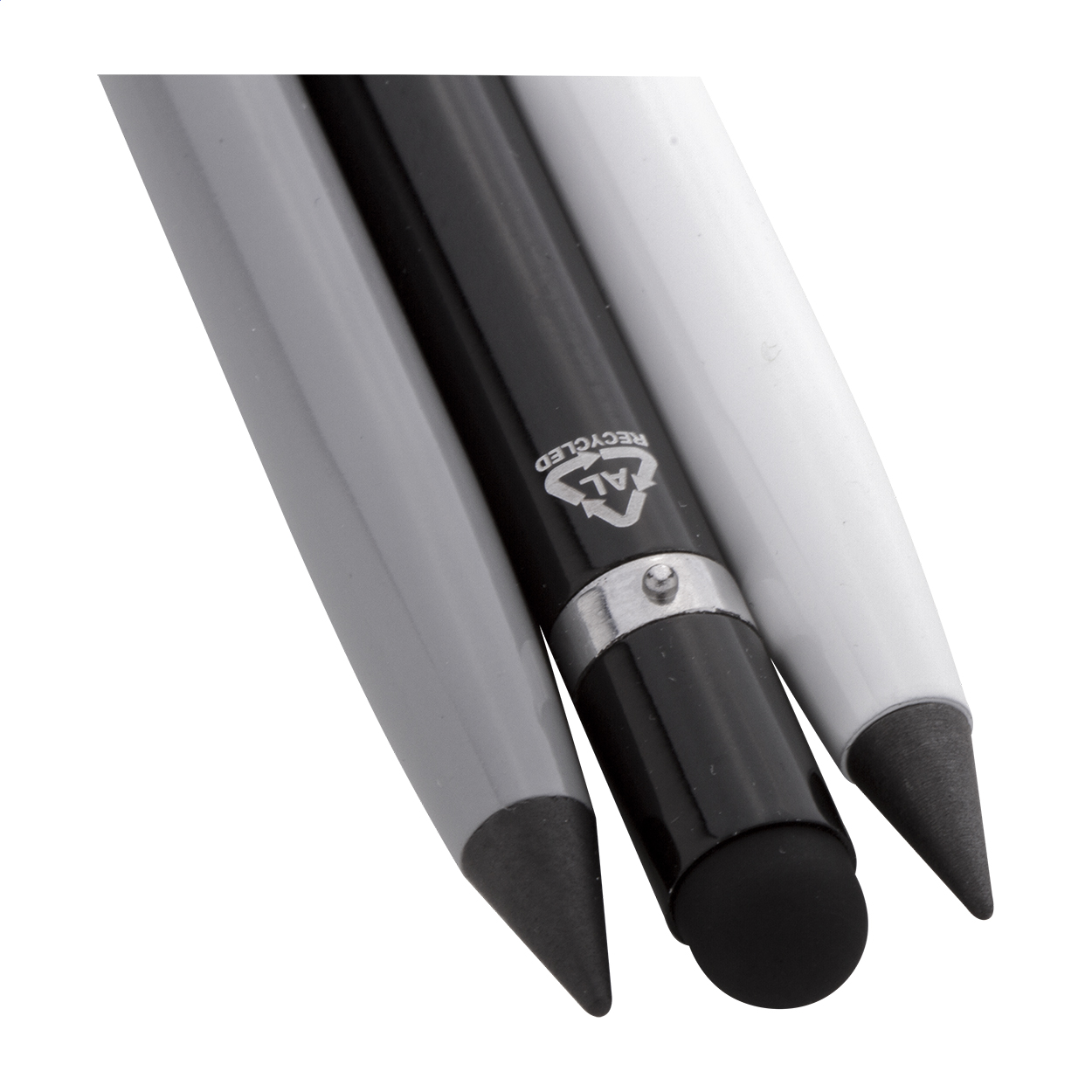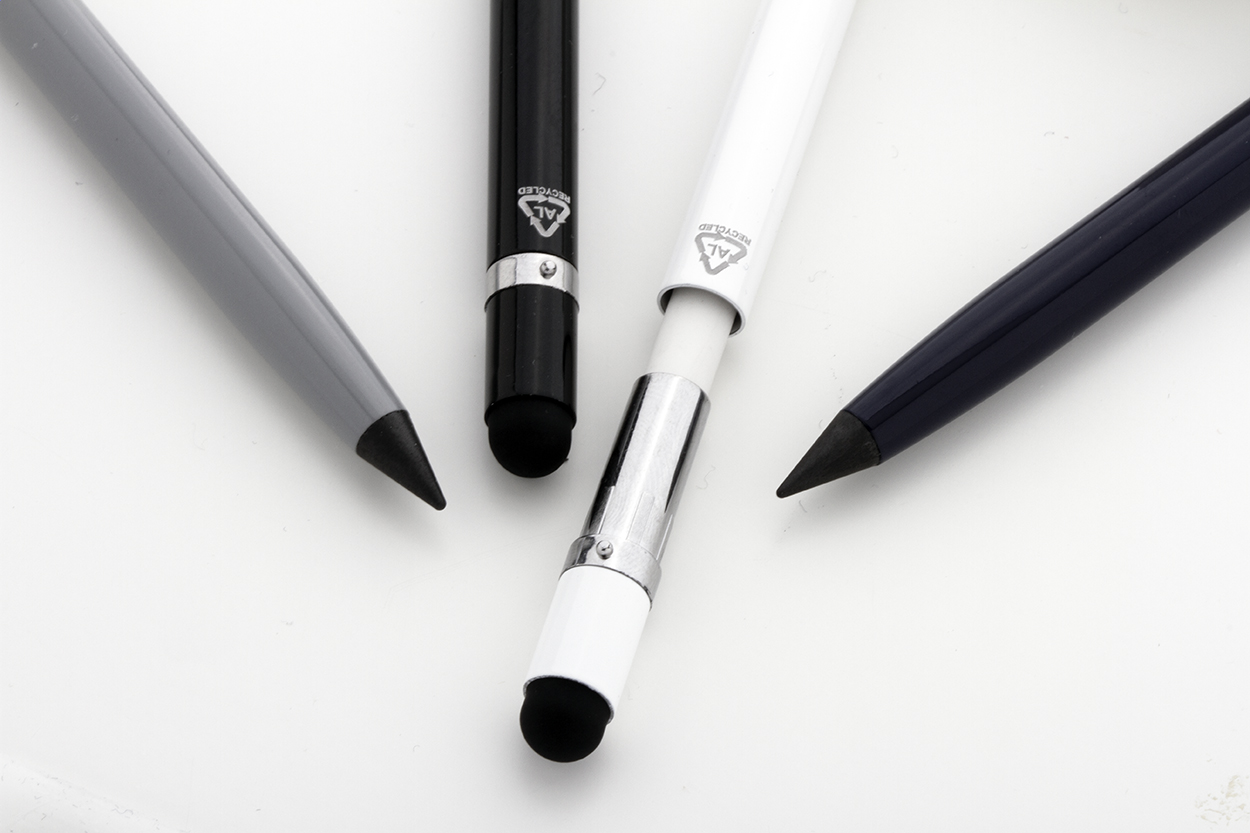 Penna in alluminio riciclato senza inchiostro di lunga durata, con gommino capacitivo e punta in lega metallica che ossida la carta. Questa penna scrive come una matita ed è anche cancellabile. Viene compresa una gomma riposta all'interno della penna.