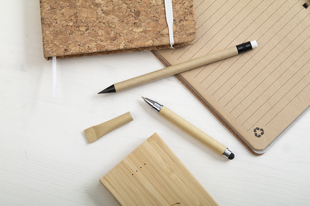Penna a sfera capacitiva in carta riciclata con cappuccio coordinato e refill blu.