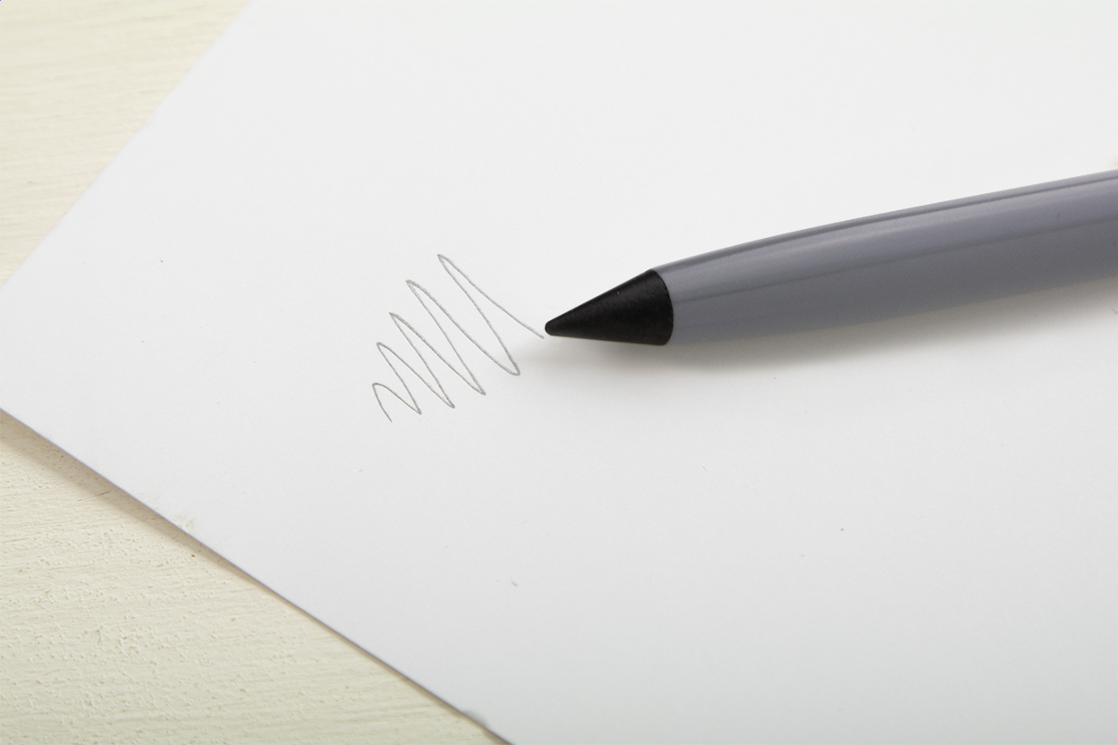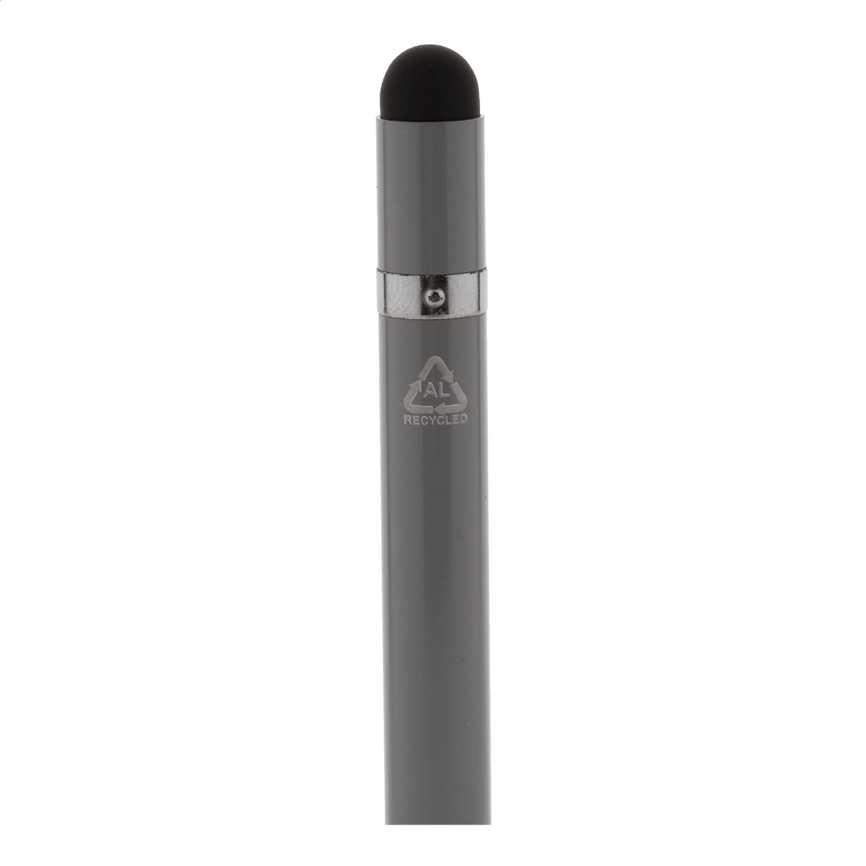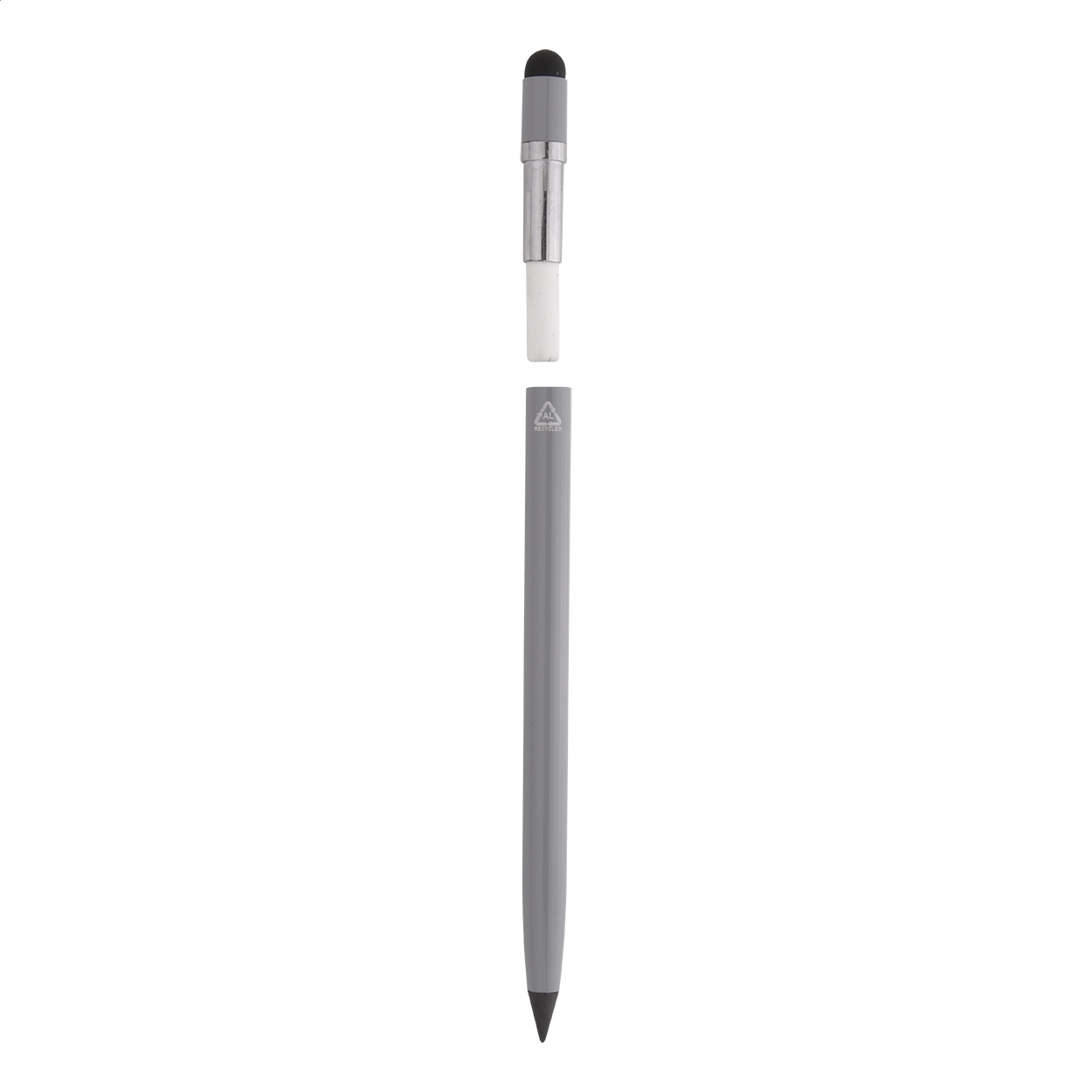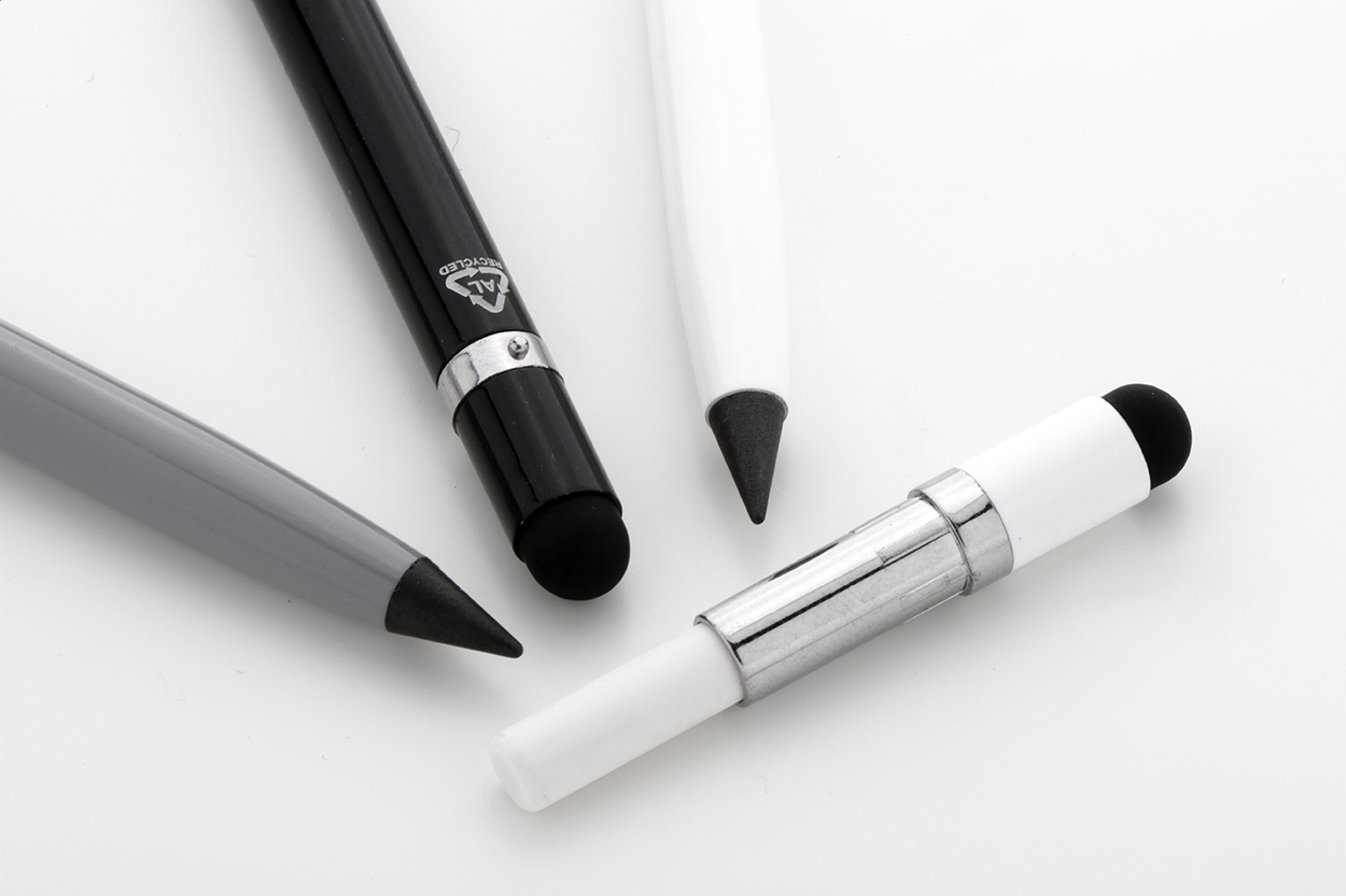 Penna in alluminio riciclato senza inchiostro di lunga durata, con gommino capacitivo e punta in lega metallica che ossida la carta. Questa penna scrive come una matita ed è anche cancellabile. Viene compresa una gomma riposta all'interno della penna.