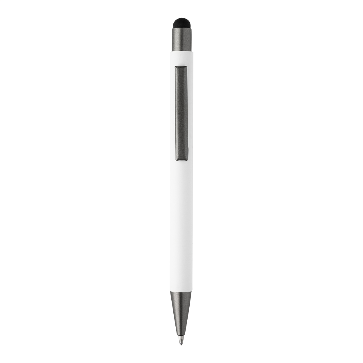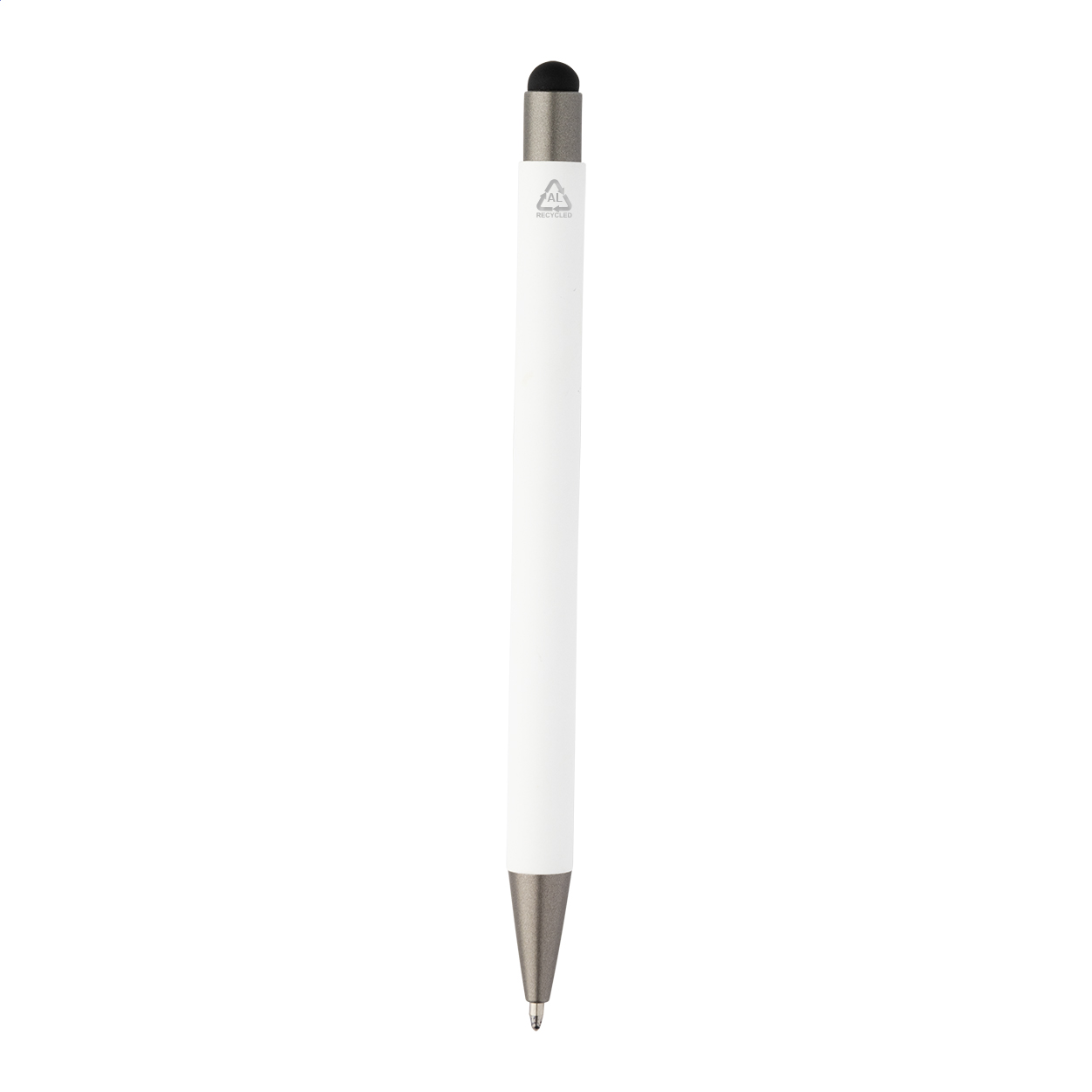 Penna a sfera capacitiva in alluminio riciclato con refill blu, fusto gommato e parti con finitura color canna di fucile.