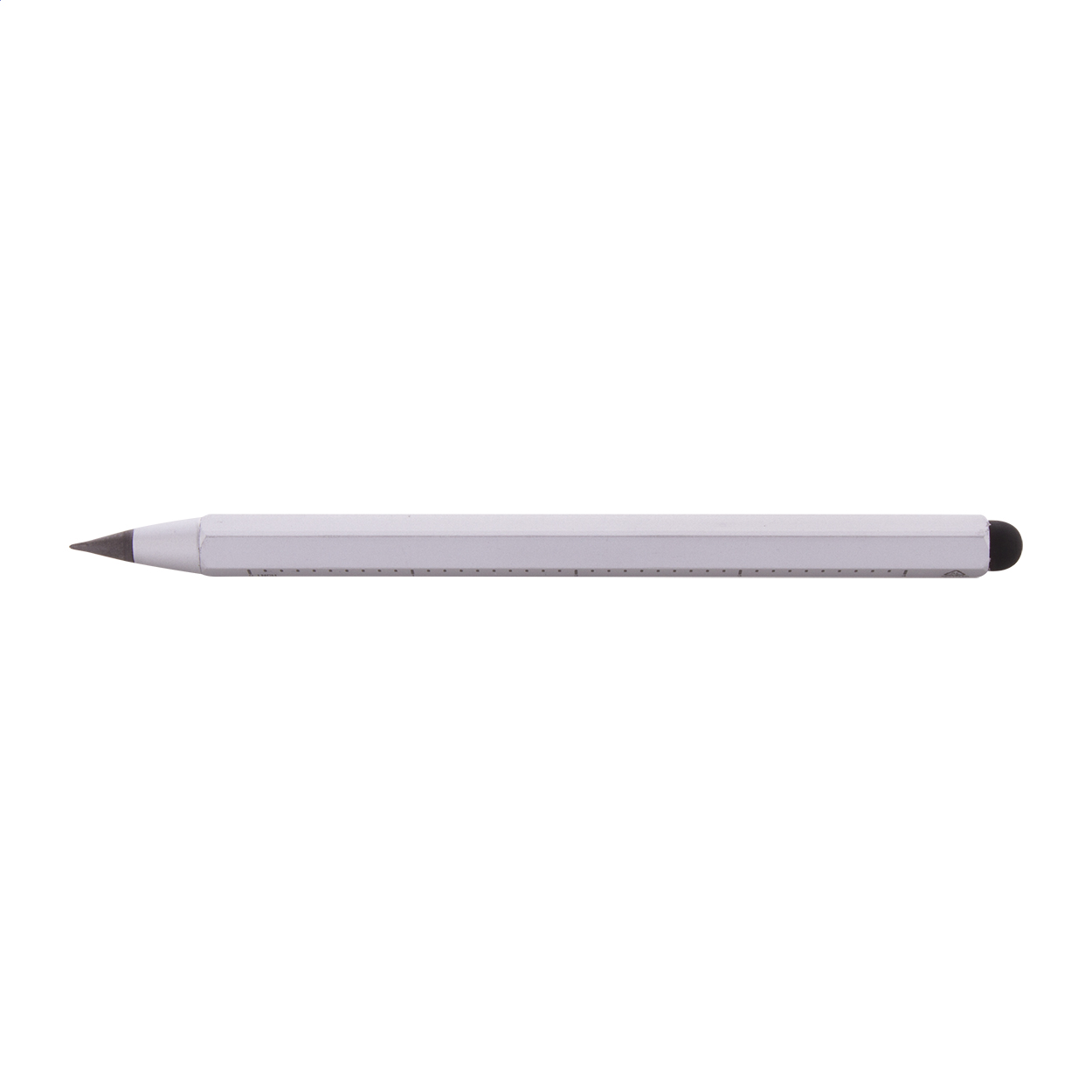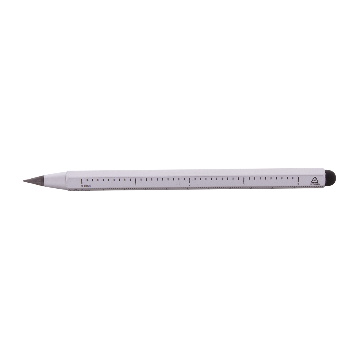 Penna in alluminio riciclato senza inchiostro di lunga durata con punta in lega metallica che ossida la carta e gommino capacitivo. Con fusto esagonale che integra righello da 11 cm e da 4 pollici. Questa penna scrive come una matita ed è anche cancellabile.
