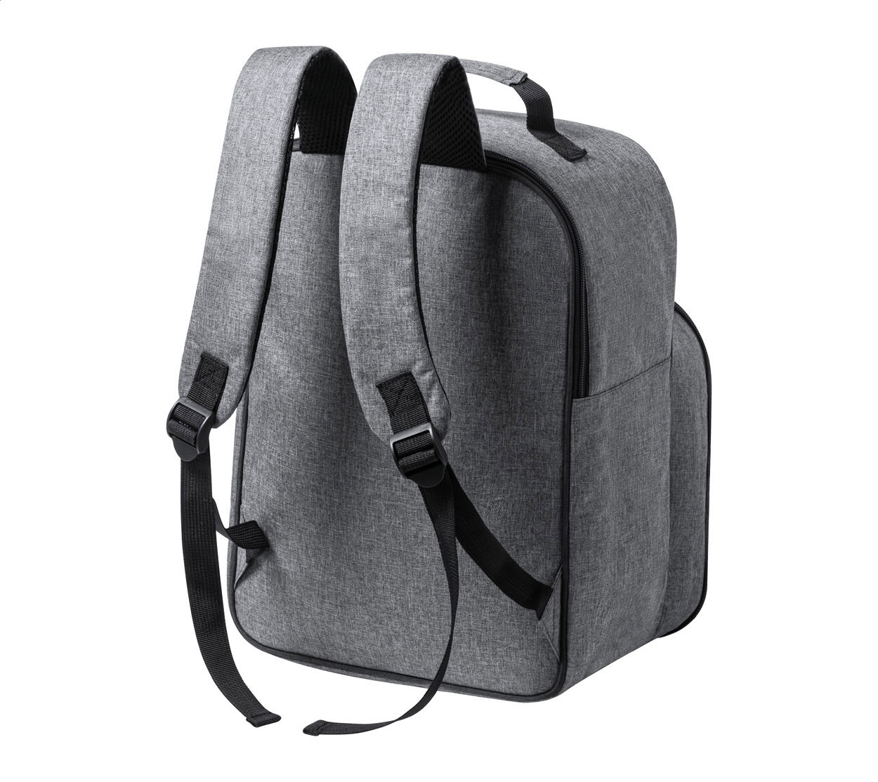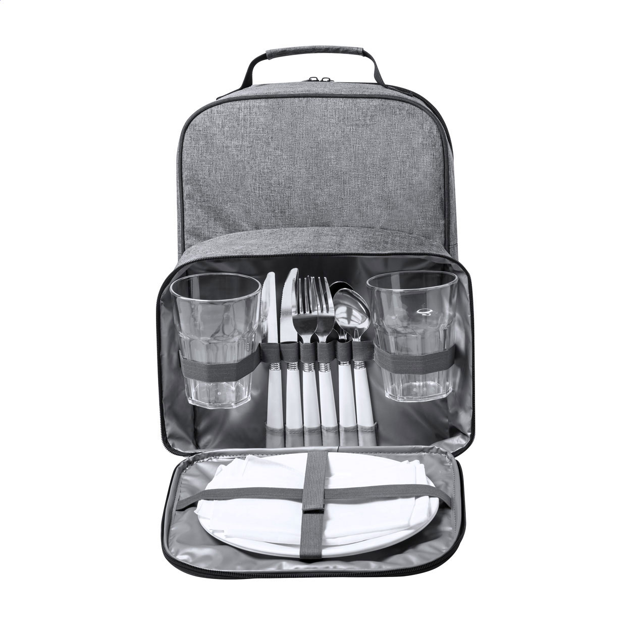 Zaino frigo da picnic in RPET con cinghie e schienale imbottiti, scomparto frigo con imbottitura in PEVA. Include 2 bicchieri, 2 coltelli, 2 cucchiai, 2 forchette, 2 piatti e 2 tovaglioli. Poliestere 600D RPET con etichetta RPET.