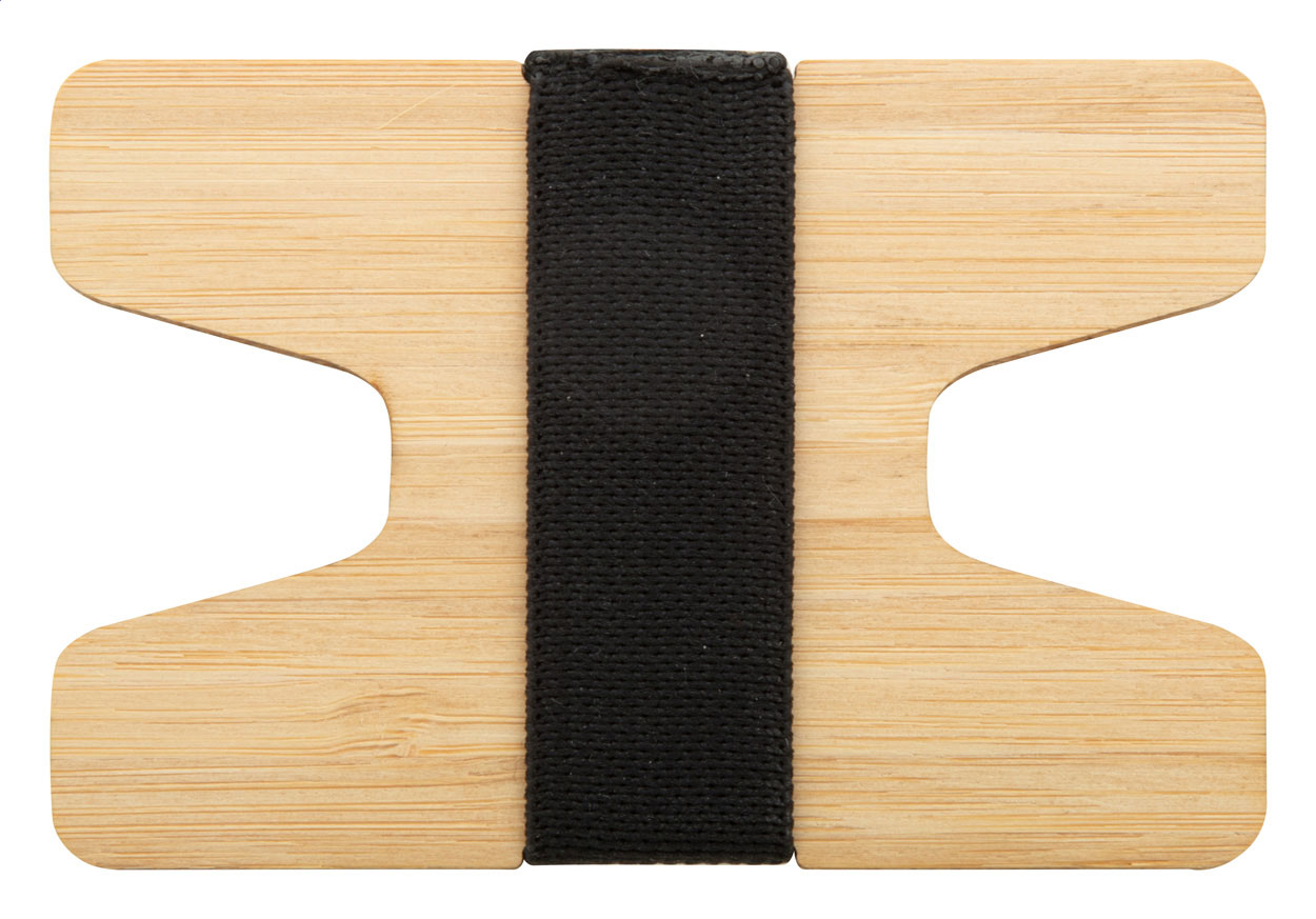Portacarte in compensato di bambù con cinturino in gomma elastica.