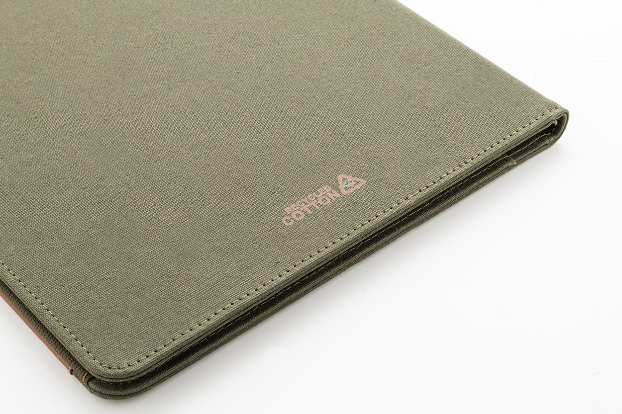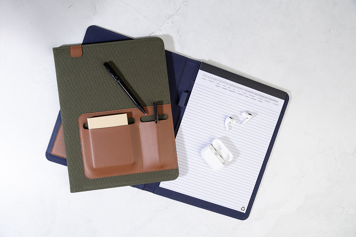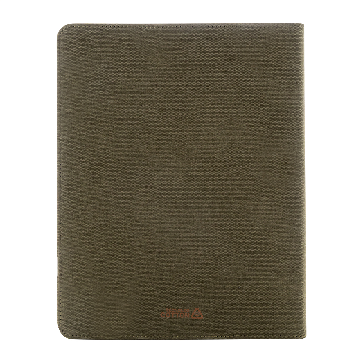 Cartella portadocumenti in canvas e pelle PU riciclata, formato A4, con molteplici tasche organizer interne e frontali, e blocco da 20 fogli a righe in carta riciclata. 70% cotone riciclato e 30% poliestere RPET.