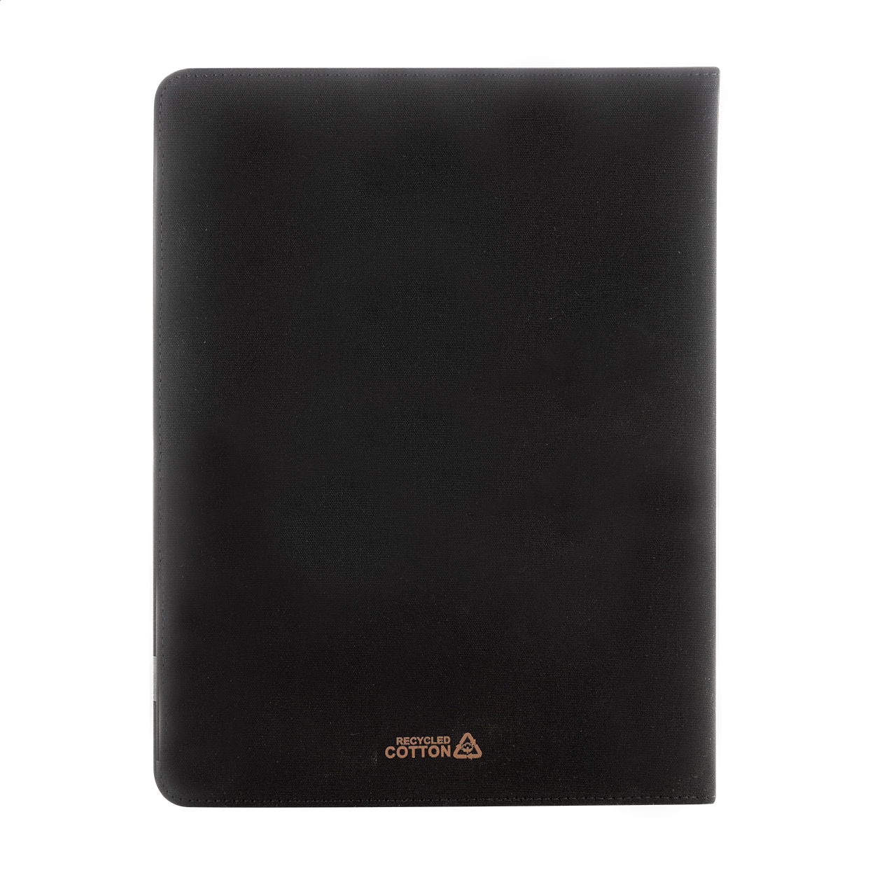 Cartella portadocumenti in canvas e pelle PU riciclata, formato A4, con molteplici tasche organizer interne e frontali, e blocco da 20 fogli a righe in carta riciclata. 70% cotone riciclato e 30% poliestere RPET.