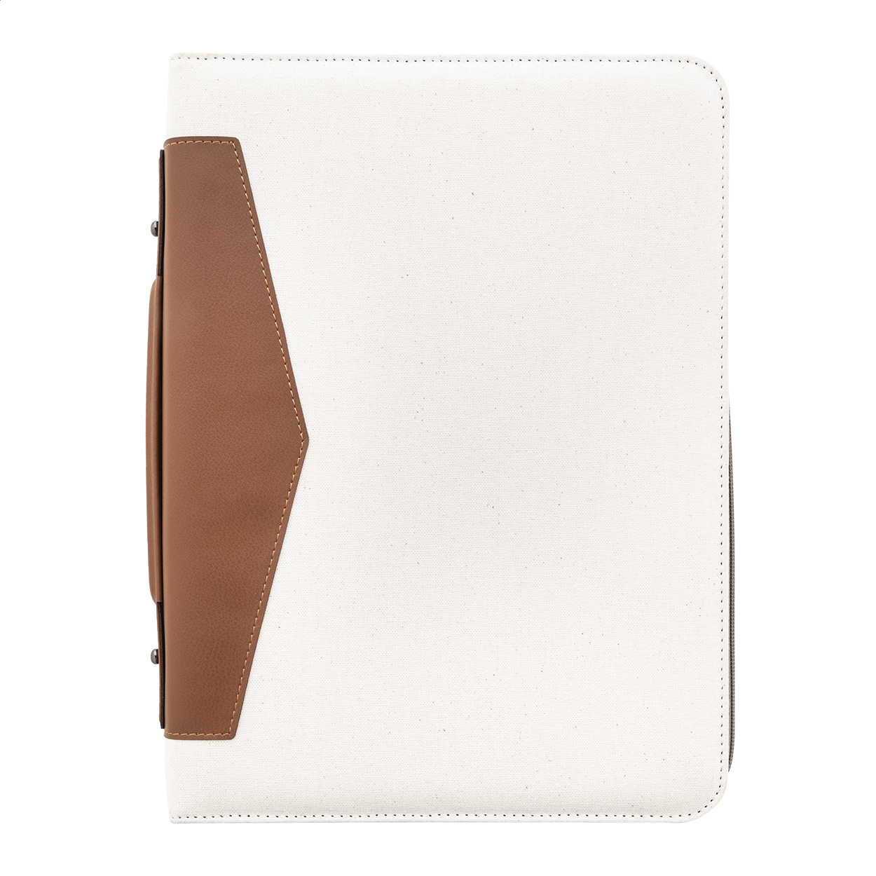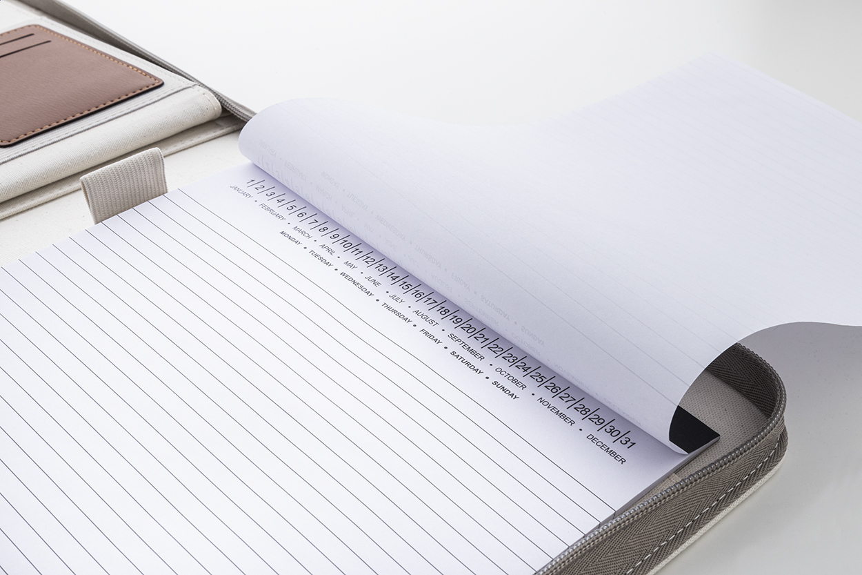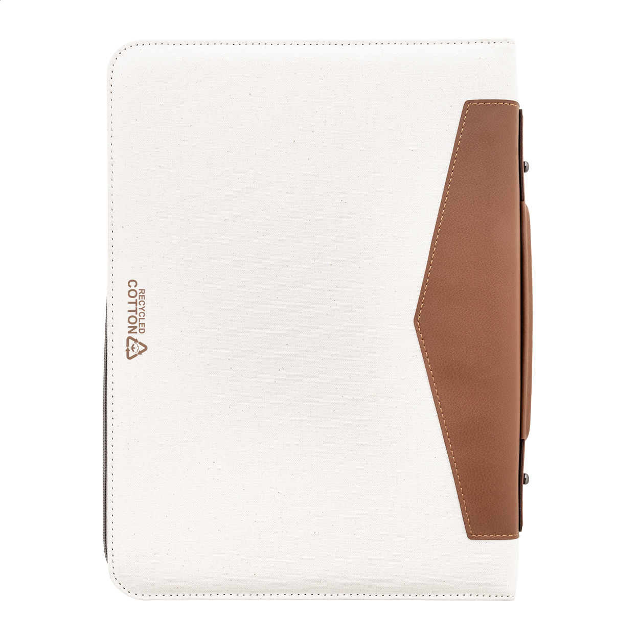 Cartella portadocumentiformato A4 in canvas riciclato e pelle PU riciclata, pratica impugnatura, molteplici scomparti interni e blocco note da 20 fogli in carta riciclata a righe. Materiale: 70% cotone riciclato e 30% poliestere RPET.
