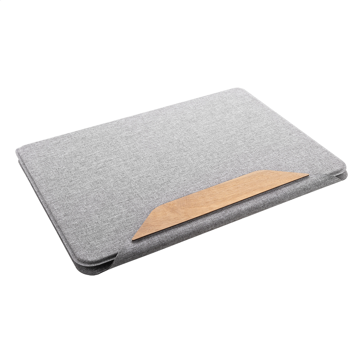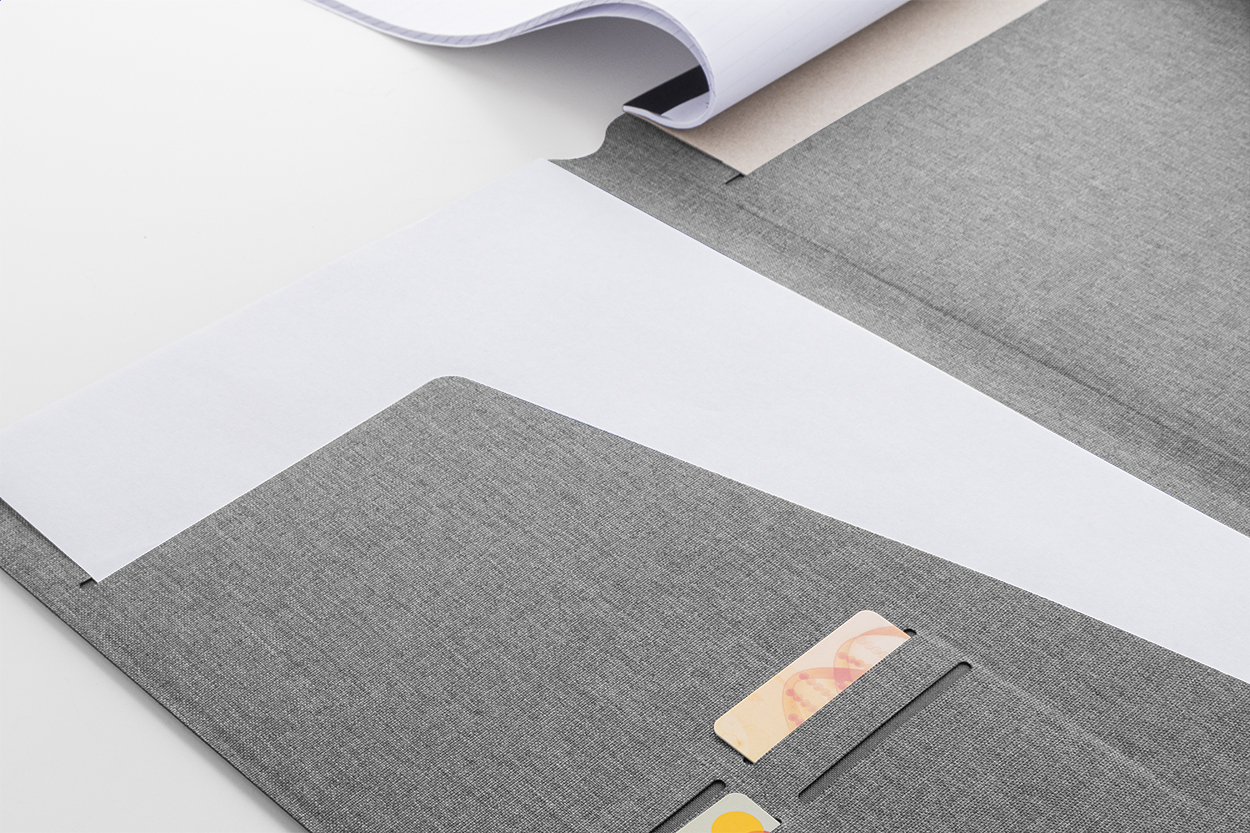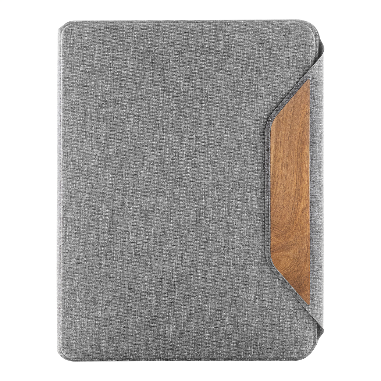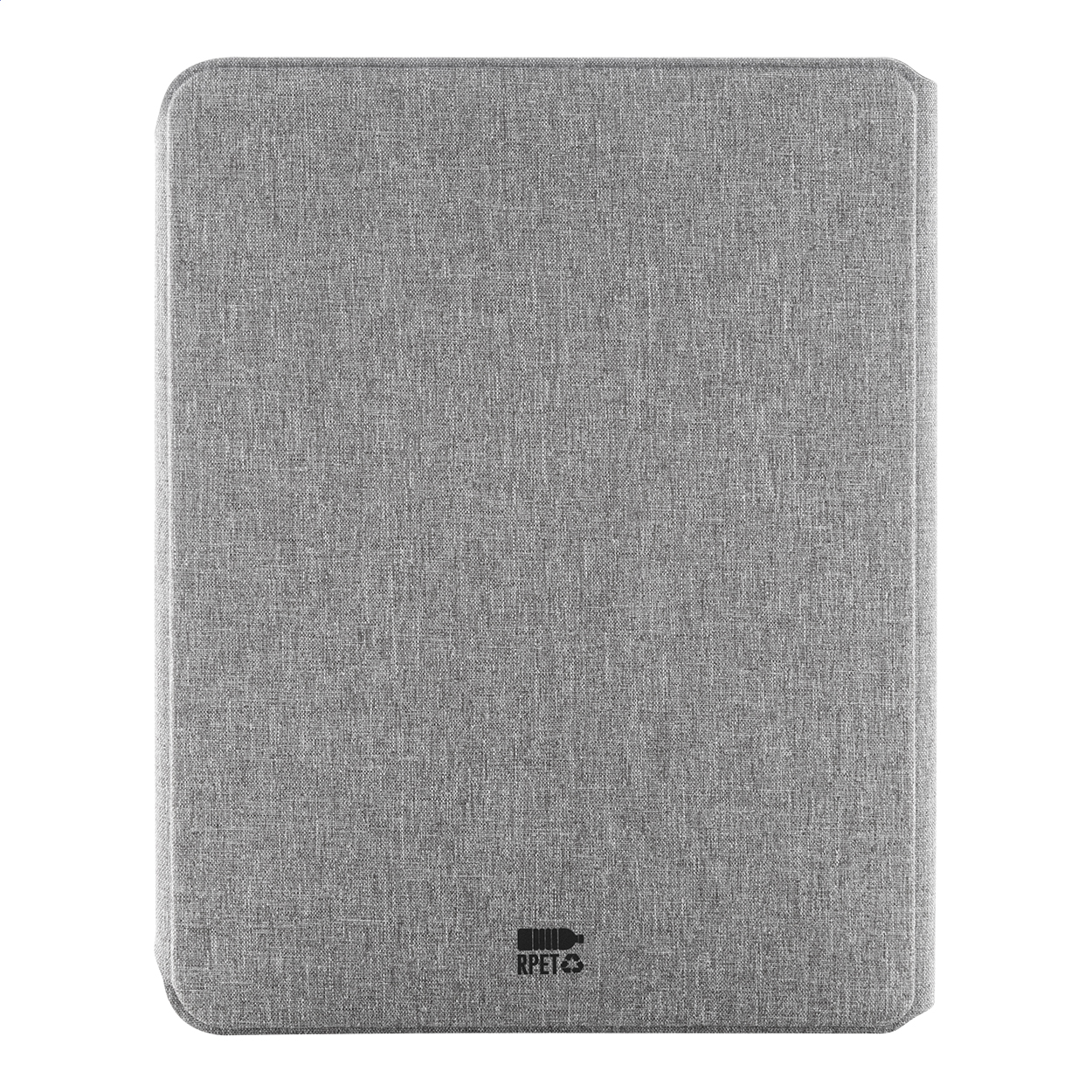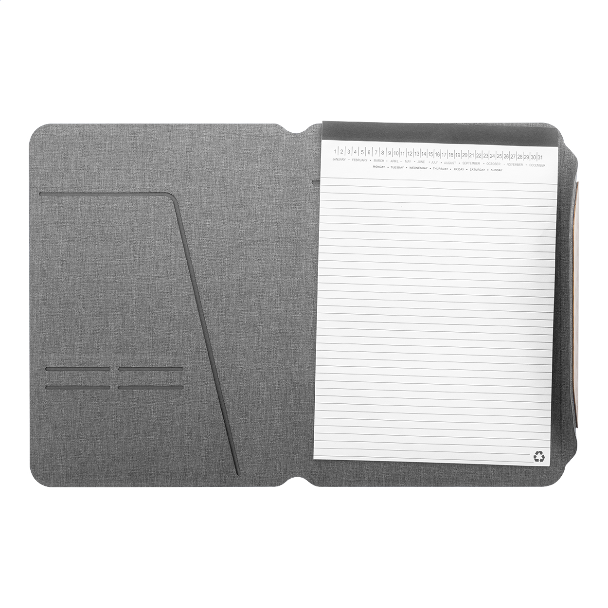 Cartella portadocumenti in poliestere RPET, formato A4, con molteplici tasche organizer interne, chiusura magnetica, dettagli in legno di noce e blocco da 20 fogli a righe in carta riciclata.