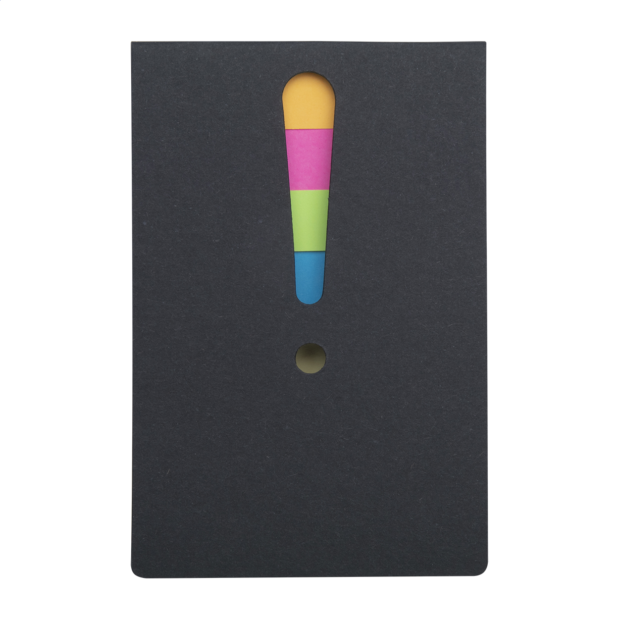 Blocco foglietti adesivi in due formati, 25 foglietti grandi e 100 piccoli (in 4 colori diversi). Con punto esclamativo fustellato sulla copertina.