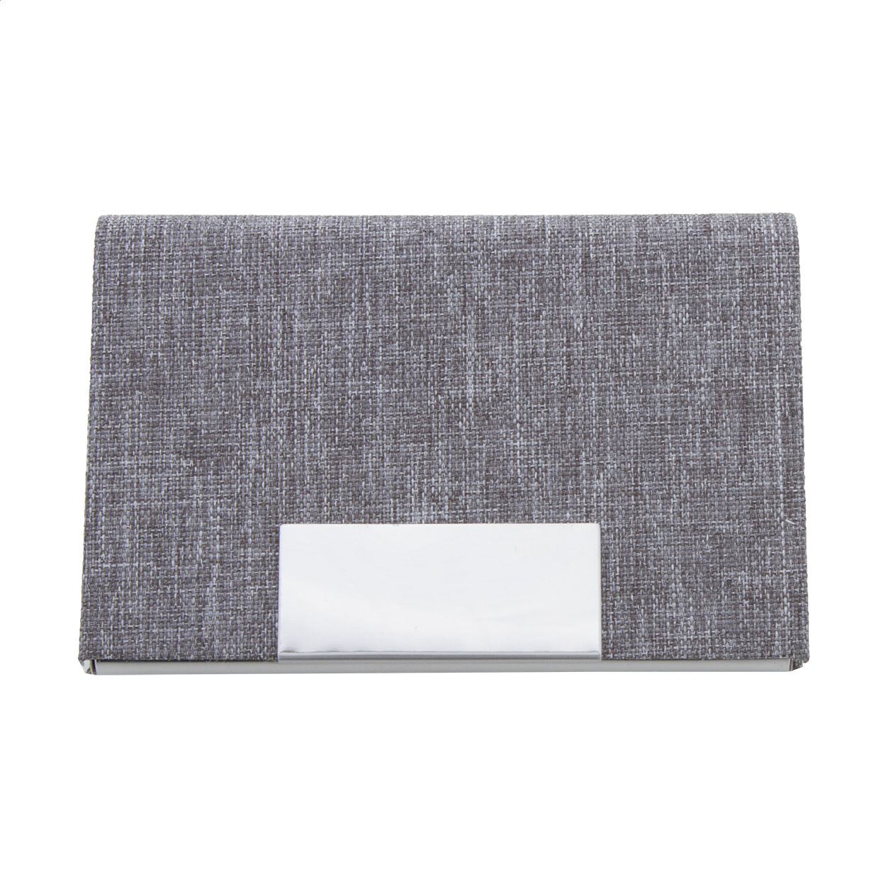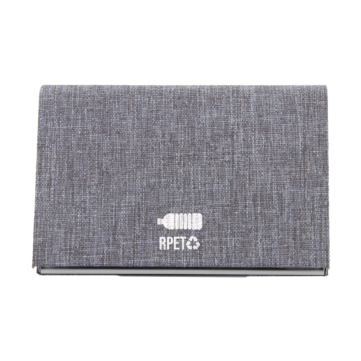 Portabiglietti da visita in metallo rivestito in poliestere RPET con parte metallica stampabile.
