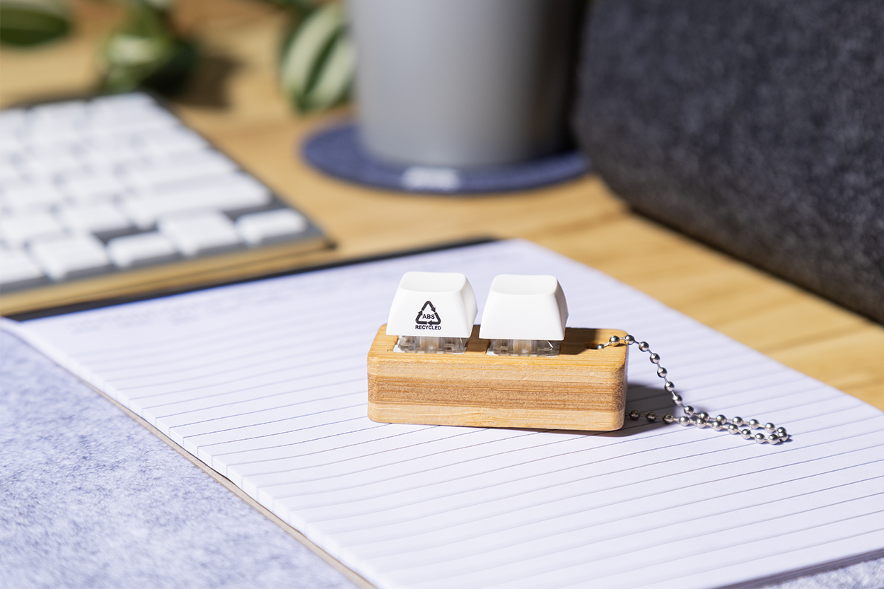 Portachiavi in bambù con catenella in metallo e 2 tasti antistress in ABS riciclato che emulano quelli di una tastiera.