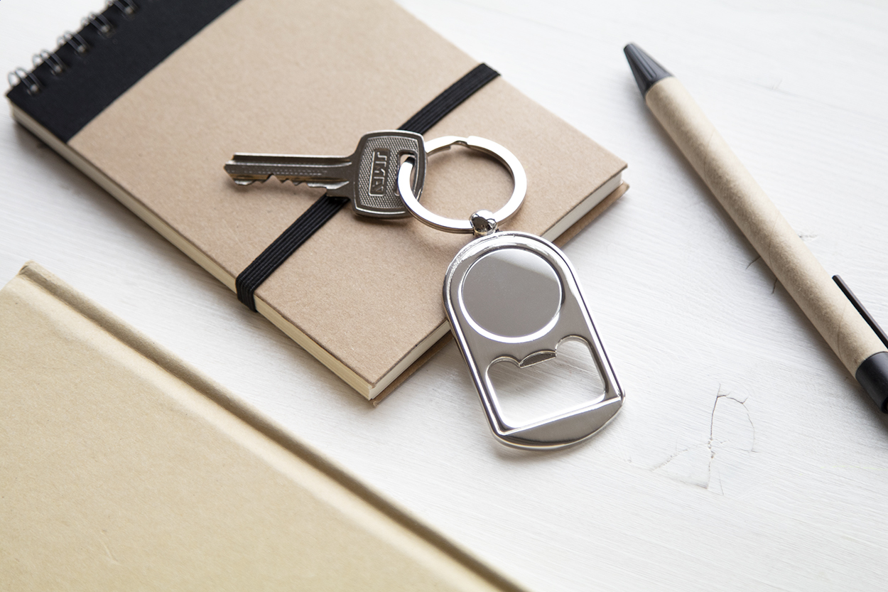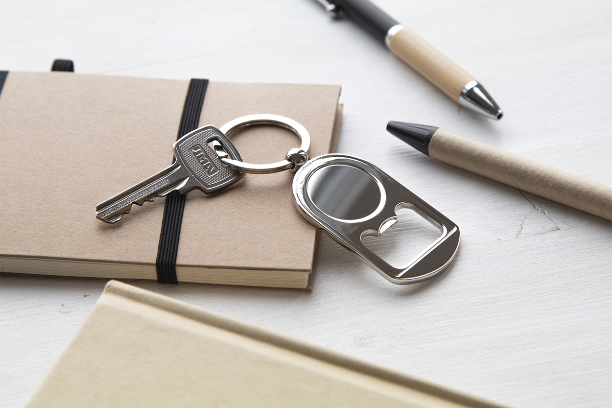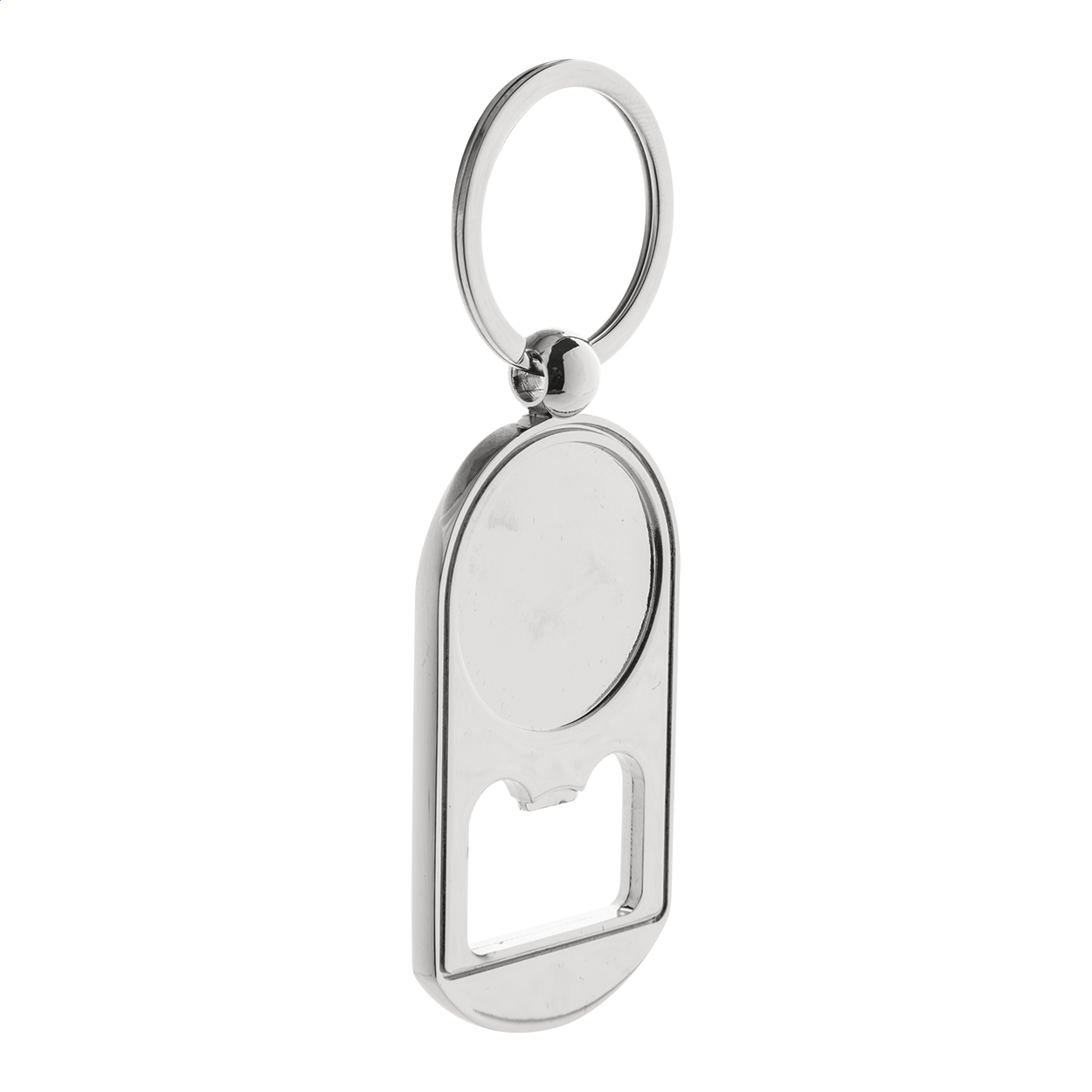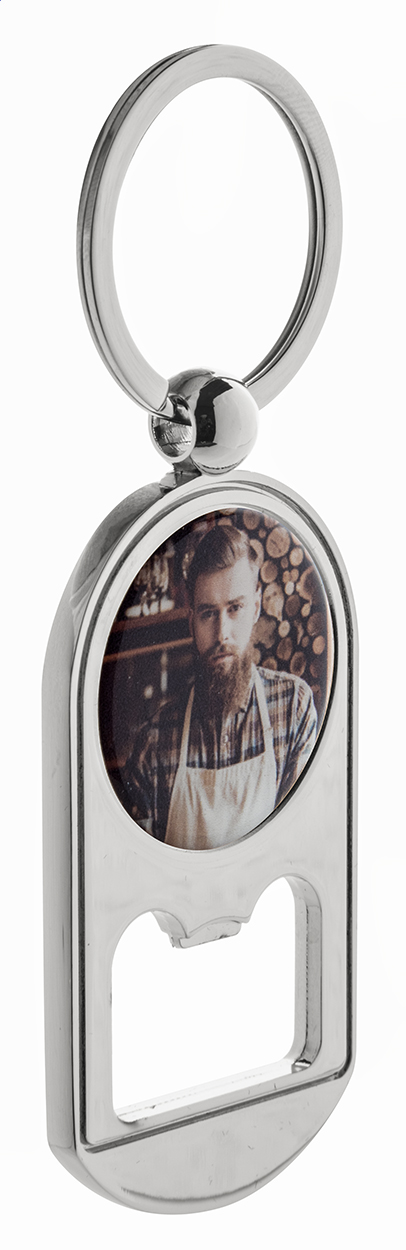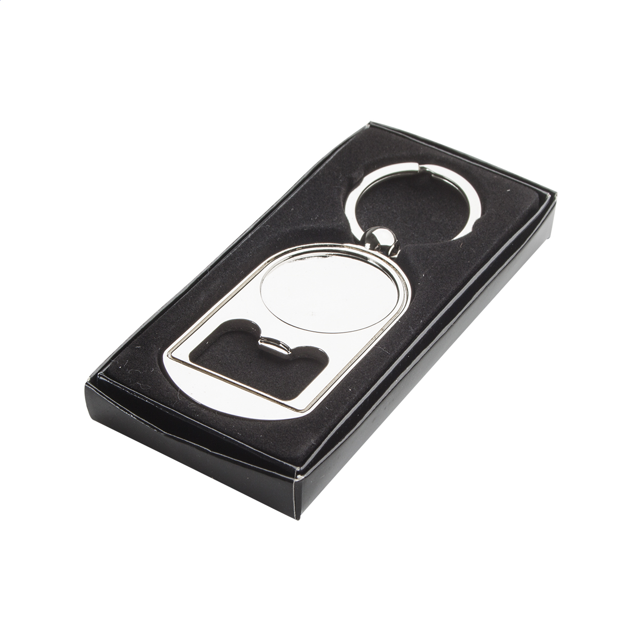Portachiavi con apribottiglie in metallo e personalizzazione in resina epossidica. In scatola regalo nera. Il prezzo include la stampa in resina epossidica. MOQ: 100 pezzi.